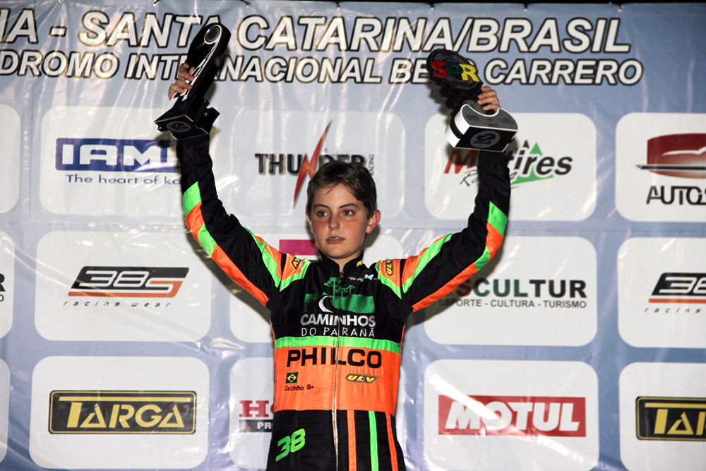 Compartilhar no Facebook Compartilhar no Twitter Compartilhar no Google+ Compartilhar no Pinterest Última competição no Kartódromo Beto Carrero, em Penha (SC), antes do Campeonato Brasileiro de Kart, a 2ª etapa da Copa SPR Light reuniu 234 pilotos no último final de semana, com sua grande maioria aproveitando para fazer os últimos ajustes em seus equipamentos visando o nacional. Dentre eles estava o paranaense José Muggiati Neto (PHILCO | Caminhos do Paraná), atual campeão sul-brasileiro da categoria Júnior. Integrando um grid de alta qualidade, Muggiati participou dos treinos da quinta-feira com motores próprios e no dia seguinte passou a utilizar os motores fornecidos por sorteio pela organização. O primeiro bom resultado chegou já na sexta-feira, quando o curitibano garantiu a pole position mesmo dando apenas quatro das possíveis 12 voltas em função da quebra de seu motor. A rodada teve duas baterias, ambas disputadas no sábado (24), e na primeira, após largar bem e manter-se à frente, José Muggiati Neto venceu com boa vantagem sobre o segundo colocado. Na segunda, com grid invertido entre os primeiros colocados, o piloto da equipe I R Competições largou em 6º e fez belas ultrapassagens no início da prova para mais uma vez conquistar a vitória. Com a dupla vitória, o piloto apoiado pela PHILCO e Caminhos do Paraná subiu no pódio em primeiro lugar, confirmando ser um dos principais candidatos ao título de campeão brasileiro de 2017 na categoria Júnior. “Acho que estamos prontos para a disputa do Brasileiro. Este ano tem sido perfeito para mim e espero poder manter esta competitividade em julho, quando lutarei pelo título nacional. Quero agradecer aos meus patrocinadores, a PHILCO e Caminhos do Paraná, por seu grande apoio, sem eles eu não estaria competindo este ano. (leaguefeed.net) Agradeço também à minha família, minha equipe e, principalmente, à Deus”, disse José Muggiati Neto após a cerimônia de pódio. Texto: Erno Drehmer Foto: Mario FErreira