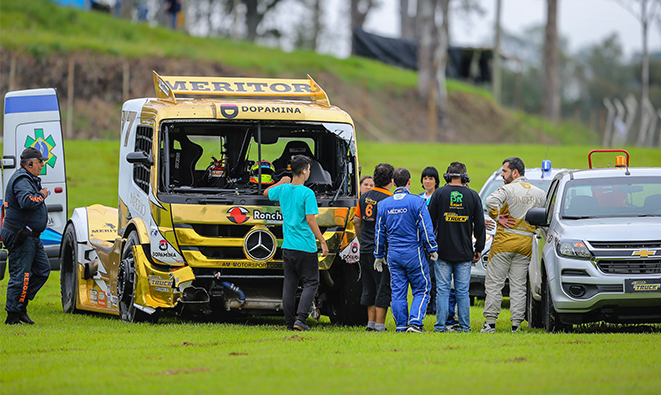 Velocidade no Asfalto Fraturas ameaçam participação de André Marques na Copa Sudeste em Interlagos Por Eni Alves Publicado em 26 de abril de 2018 Compartilhar no Facebook Compartilhar no Twitter Compartilhar no Google+ Compartilhar no Pinterest Acidente em Guaporé rendeu três fraturas nas costelas de André Marques.Crédito: RR Media/Rodrigo Ruiz . A etapa de Guaporé (RS) da Copa Truck, disputada no último dia 15 de março, deixou muito mais lembranças para André Marques do que os troféus, pódios e classificação para a Grande Final. Novos exames realizados no decorrer desta semana mostraram que o piloto correu a etapa com três costelas fraturadas, em virtude do acidente que sofreu ainda nos treinos da sexta-feira (13). André Marques realizou uma tomografia computadorizada no Hospital Nove de Julho, em São Paulo, que constatou fraturas de até 5mm nos arcos oito, nove e dez ao lado esquerdo, na região das costas. Também foram detectados alguns edemas que atingiram a base do pulmão. “Normalmente sentimos dores após um acidente, mas que passam no decorrer de alguns dias. Neste caso, as dores aumentaram, até mesmo quando respiro, além do roxo na pele. Busquei a orientação médica aqui em São Paulo e o resultado apareceu. Agora é fazer todo o tratamento, bastante repouso e esperar que a recuperação aconteça naturalmente”, afirmou André Marques, que foi ao pódio da segunda corrida com um quarto lugar e garantiu o Troféu Bronze da Copa Sul. O resultado dos exames só fazem ressaltar a dedicação do time da AM MotorSport/Império Truck Racing para atingir os objetivos da temporada. Enquanto os mecânicos passaram boa parte da noite de sexta-feira recuperando o caminhão, André foi para a pista no sábado e no domingo superando as dores. “Apesar dos medicamentos que tomei, a dor era intensa, porque é justamente onde tem o apoio do banco. Cada balanço do caminhão parecia uma pancada na costela. Achei que não iria conseguir fazer a corrida, mas quando vi a dedicação do pessoal na recuperação do caminhão, além de todo o trabalho que estamos desenvolvendo desde o ano passado, me deu forças para seguir na disputa. E acabou que o resultado na pista veio com os pódios e o título do Cirino”, lembra André, que pode valorizar ainda mais o resultado. No entanto, a participação do piloto e dono da equipe na etapa de abertura da Copa Sudeste, dia 27 de maio ainda é incerta. “Felizmente, tem um bom intervalo de tempo entre uma corrida e outra. Vamos ver como será a recuperação durante este mês para só então poder confirmar”, conta André, que acelera o caminhão Mercedes-Benz #77 com a marca da Cerveja Império. A AM MotorSport/Império Truck Racing tem o patrocínio da Cerveja Império, Dopamina Energy Drink e Mercedes Club; e utiliza os caminhões Mercedes-Benz.