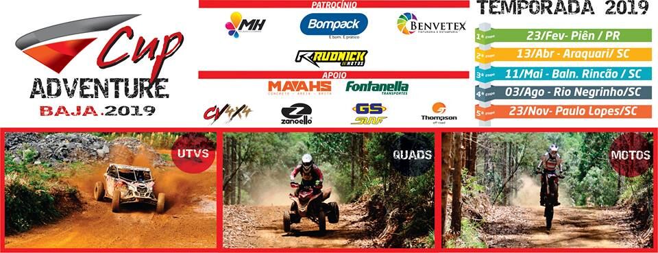A Adventure Cup Baja 2019 tem a realização da ASCPE – Associação Catarinense em Prol do Esporte e Cultura, com Patrocínio da MH Tinturaria, Bompack, Benvetex Tintutaria e Estamparia, Rudnick Moto Peças, Chopp Sonnenbier, o apoio de CV 4×4, GS Motos SUNF, Thompson Off Road, Maahs Concreto, Fontanella Transportes e Zanoello Premiações, com a supervisão da FPRM – Federação Paranaense de Motociclismo.