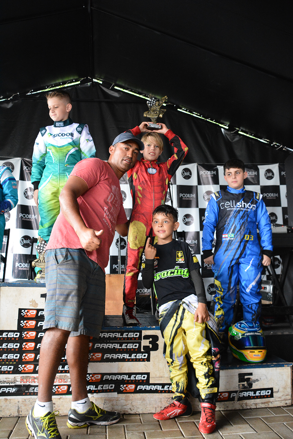 Orgulhoso com a atuação do Menino de Ferro, o preparador Rodrigo Paixão entrega o troféu ao piloto.