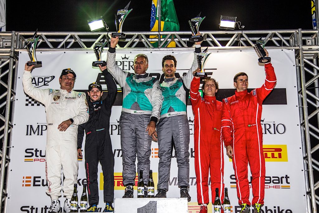 Compartilhar no Facebook Compartilhar no Twitter Compartilhar no Google+ Compartilhar no Pinterest Xandy e Xandinho Negrão abrem a temporada 2019 com o lugar mais alto do pódio na categoria GT3 Vitória na GT3 (Bruno Terena) A etapa de abertura da Império Endurance Brasil da temporada 2019 finalizou a corrida de quatro horas na tarde deste sábado, no Autódromo de Curitiba, em Pinhais, no Paraná. A bordo da Mercedes AMG #09 a dupla de pai e filho, Xandy e Xandinho Negrão, começaram com o pé direito e venceram na categoria GT3, e disputaram a vitória também na geral até os últimos metros antes da bandeirada. Fecharam com a segunda colocação atrás do protótipo AJR da categoria P1 pilotado pelo trio: Tarso Marques, Vicente Orige e Carlos Kray. “Começar vencendo é sempre muito bom. Meu pai fez uma excelente largada e ganhou várias posições, no meu primeiro stint tivemos um furo no pneu traseiro esquerdo e paramos novamente, mas por ser uma corrida longa fomos buscar a diferença entre os líderes. Chegamos muito perto da vitória na geral também, o protótipo #88 que é da categoria mais rápida, vinha economizando combustível, então conseguimos chegar nele e por poucos metros não cruzamos a linha de chegada com mais essa vitória. Estamos felizes com o resultado, a categoria vem crescendo, trazendo mais carros para a disputa e se mantendo muito competitiva”, explicou Xandinho Negrão. Essa foi a quinta vitória da dupla da equipe Scuderia 111, que no ano passado quando retornaram as competições, venceram quatro das seis provas que participaram, sendo duas dessas vitórias na geral. “Ganhar sempre é bom e ainda chegamos em segundo lugar a três décimos do líder, realmente foi ótimo. Tivemos o Chico Longo com Daniel Serra com carro novo, a Ferrari 488, muito rápida, mas classificação é uma coisa, treino é treino e corrida é corrida, o que vale é isso ai, ganhamos e estamos muito felizes”, contou o piloto Xandy Negrão. A Império Endurance Brasil volta a acelerar no dia 25 de maio pela primeira vez no Autódromo de Goiânia, em Goiás.