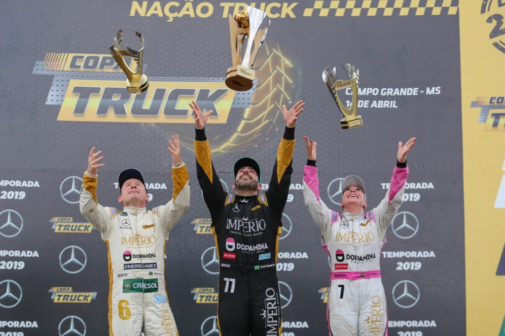 Compartilhar no Facebook Compartilhar no Twitter Compartilhar no Google+ Compartilhar no Pinterest A AM Motorsport sai de Campo Grande (MS) com um saldo bastante positivo e excesso de bagagem no retorno pra casa. O time garantiu quatro troféus neste fim de semana com os pilotos Wellington Cirino, na corrida 1, e Débora Rodrigues e André Marques, na corrida 2. André ainda garantiu o Troféu Bronze da Primeira Copa e está assegurado na Grande Final, que será disputada em São Paulo no dia 8 de dezembro. As vitórias nas duas corridas foram de Beto Monteiro e Paulo Salustiano. Pilotos da AM Motorsport fizeram a festa em Campo Grande. Crédito: Rodrigo Ruiz/RR Media “Estamos na final”, celebrou André Marques. “No ano passado eu garanti na segunda copa, e este ano já garantimos na primeira. Agora, tenho o restante do campeonato para cumprir outros objetivos: classificar o Cirino e a Débora para a Grande Final e vencer uma das corridas”, conta André, que piloto o caminhão #77 com o patrocínio da Cerveja Império. Débora Rodrigues também era só alegria, depois de ser a pole na corrida 2 e competir em condições de igualdade, até terminar a prova na terceira posição”e na quarta colocação da Primeira Copa. “Foi uma corrida maravilhosa. Estou muito satisfeita e orgulhosa em estar recebendo da engenharia da Mercedes-Benz o mesmo tratamento. Isso me coloca em condição de igualdade na pista para brigar por mais resultados”, avaliou a piloto do “Baby Pink”#7. Depois de largar na pole position da corrida 1, Wellington Cirino concluiu a prova na terceira posição. Na corrida 2, quando tentou disputar posições, sentiu uma vibração diferente no motor do caminhão e decidiu poupar o equipamento para não sofrer quebras. “O caminhão estava muito bom na primeira corrida, mas com o desgaste comecei a sentir essa trepidação do motor. Vamos chegar na sede da equipe e trabalhar para descobrir o que ocasionou isso e solucionar para a próxima etapa”, avaliou. A segunda copa será aberta no dia 2 de julho, no Autódromo de Londrina. A AM MotorSport tem o patrocínio da Cerveja Império e Cresol, com o apoio da Dopamina Energy Drink, Embreagex, Truck Van, Radiadores Visconde, Nino Faróis, Molas Marcheti, Frum, Cobreq e Mercedes Club. O time acelera os caminhões Mercedes-Benz. Resultado da corrida 1 1. Beto Monteiro (Volkswagen), 14 voltas em 25min38s039 2. Paulo Salustiano (Volkswagen), a 7s719 3. Wellington Cirino (Mercedes-Benz), a 11s074 4. André Marques (Mercedes-Benz), a 22s001 5. Felipe Giaffone (Iveco), a 29s140 6. Jaidson Zini (Iveco), a 29s763 7. Renato Martins (Volkswagen), a 38s525 8. Debora Rodrigues (Mercedes-Benz), a 39s414 9. Regis Boessio (Volvo), a 40s320 10. Rogerio Castro (Mercedes-Benz), a 44s186 11. Roberval Andrade (Mercedes-Benz), a 58s330 12. Clodoaldo Monteiro (MAN), a 1min02s123 13. Djalma Fogaça (Ford), a 1min07s890 14. Jô Augusto (Volkswagen), a 1min08s438 15. Adalberto Jardim (Ford), a 1min18s941 16. Fabio Carvalho (Iveco), a 1min52s586 17. Luiz Lopes (Iveco), a 1 volta Não completaram 75% da prova Djalma Pivetta (Iveco), a 6 voltas Leandro Totti (Mercedes-Benz), a 7 voltas Maikon Lauck (Mercedes-Benz), a 11 voltas Fabio Fogaça (Ford), a 11 voltas Luiz Carlos Zapelini (MAN), a 11 voltas Hiro Yano (Volvo), a 13 voltas Melhor volta: Beto Monteiro, 1min48s742 Resultado da corrida 2 1. Paulo Salustiano (Volkswagen), 14 voltas em 25min38s546 2. Beto Monteiro (Volkswagen), a 2s603 3. Debora Rodrigues (Mercedes-Benz), a 21s282 4. Felipe Giaffone (Iveco), a 23s257 5. André Marques (Mercedes-Benz), a 23s493 6. Clodoaldo Monteiro (MAN), a 39s956 7. Regis Boessio (Volvo), a 41s817 8. Renato Martins (Volkswagen), a 43s546 9. Rogerio Castro (Mercedes-Benz), a 52s344 10. Jaidson Zini (Iveco), a 1min08s859 11. Djalma Pivetta (Iveco), a a 1min34s385 12. Fabio Carvalho (Iveco), a 2min11s673 13. Jô Augusto (Volkswagen), a 1 volta Não completaram 75% da prova Wellington Cirino (Mercedes-Benz), a 7 voltas Djalma Fogaça (Ford), a 7 voltas Adalberto Jardim (Ford), a 7 voltas Luiz Lopes (Iveco), a 12 voltas Roberval Andrade (Mercedes-Benz), a 14 voltas Leandro Totti (Mercedes-Benz), não largou Maikon Lauck (Mercedes-Benz),não largou Fabio Fogaça (Ford), não largou Luiz Carlos Zapelini (MAN), não largou Hiro Yano (Volvo), não largou Melhor volta: Beto Monteiro, 1min48s388 Classificação Final da Primeira Copa 1. Beto Monteiro, 78 pontos 2. Felipe Giaffone, 59 3. André Marques, 57 4. Debora Rodrigues, 48 5. Rogerio Castro, 39 6. Paulo Salustiano, 38 7. Clodoaldo Monteiro, 35 8. Regis Boessio, 30 9. Jaidson Zini, 29 10. Leandro Totti, 27 11. Luiz Carlos Zapelini, 27 12. Renato Martins, 27 13. Roberval Andrade, 24 14. Adalberto Jardim, 19 15. Wellington Cirino, 18 16. Djalma Pivetta, 15 17. Hiro Yano, 14 18. Luiz Lopes, 14 19. Jô Augusto, 9 20. Djalma Fogaça, 7 21. Fábio Carvalho, 4 Por Osires Jùnior