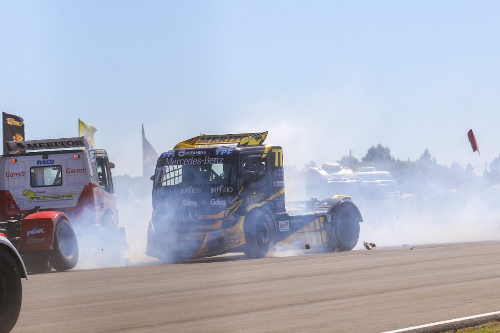 Compartilhar no Facebook Compartilhar no Twitter Compartilhar no Google+ Compartilhar no Pinterest Acidente no início da corrida 2 causou fratura de punho em André Marques. Crédito: Rodrigo Ruiz/RR Media Parecia que tudo daria certo para a equipe AM Motorsport na etapa da Copa Truck disputada neste domingo (01/09), no Autódromo Eduardo Prudencio Cabrera, em Rivera, no Uruguai, fechando a disputa da terceira copa. Wellingotn Cirino conquistou um P2 na corrida 1, André Marques havia escalado o pelotão com dez ultrapassagens e Débora Rodrigues somou pontos importantes com um P9. Mas, o início da corrida 2 acabou com tudo e deixou o time em baixa. André Marques sofreu três fraturas em punho após um acidente na largada, enquanto Débora Rodrigues e Wellington Cirino destruíram seus caminhões em outro acidente. Com os resultados de Rivera, Wellington Cirino e Débora Rodrigues seguem fora a Grande Final e terão a última oportunidade com a disputa das etapas de Cascavel, dia 6 de outubro, e do Velopark, no dia 28 de outubro. “Dos males o menor. Os caminhões ficaram destruídos e os pontos não vieram, mas tivemos a graça de sair ilesos depois de um choque a mais de 150 km/h. Pena o André ter se machucado em uma batida que ele não tinha o que fazer”, conta Wellington Cirino, que bateu com Débora Rodrigues e Paulo Salustiano na entrada da reta oposta, após precisar desviar de Felipe Giaffone que reduziu a velocidade de forma exagerada na entrada da reta oposta. André Marques sofreu acidente logo na largada da corrida 2, chocando-se com o caminhão de Jaidson Zini cruzou a pista após um toque. O choque resultou nas fraturas do punho esquerdo. “Estava empolgado porque ganhei dez posições na corrida um e tinha caminhão pra ir pra cima e até buscar um pódio. Infelizmente, houve o acidente e o prejuízo para a equipe foi grande. Os caminhões terão que ser refeitos na oficina, prejudicando o calendário que tínhamos com os eventos de patrocinadores”, comentou André, que optou por imobilizar o punho e fazer a cirurgia em São Paulo, ainda nesta segunda-feira. A realização da cirurgia e todo o período de recuperação deve deixar André Marques de fora da etapa de Cascavel. A AM MotorSport tem o patrocínio da Cerveja Império e Cresol, com o apoio da Dopamina Energy Drink, Embreagex, Truck Van, Radiadores Visconde, Nino Faróis, Molas Marcheti, Frum, Cobreq e Mercedes Club. O time acelera os caminhões Mercedes-Benz. Por Osires Júnior