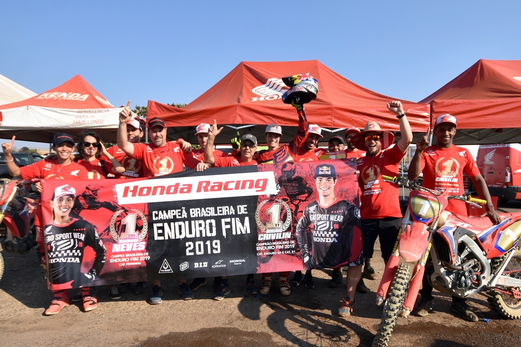 Compartilhar no Facebook Compartilhar no Twitter Compartilhar no Google+ Compartilhar no Pinterest Piloto capixaba é bicampeão das categorias Enduro GP e E1; Com o título de Bárbara Neves na EF, equipe Honda Racing fecha campeonato com três taças Equipe Honda Racing comemora três títulos no Campeonato Brasileiro de Enduro FIM 2019. Crédito: Janjão Santiago/Mundo Press Patrocínio (MG) – A equipe Honda Racing está em festa pela conquista de três títulos no Campeonato Brasileiro de Enduro FIM 2019, neste domingo (15/9), em Patrocínio (MG). O capixaba Bruno Crivilin foi o grande destaque e fechou a temporada com o bicampeonato nas categorias E1 e Enduro GP, direcionada aos mais rápidos da competição. Ele acelerou a motocicleta Honda CRF 250RX. Além disso, a goiana Bárbara Neves confirmou a taça da classe EF, a segunda da sua carreira, pilotando o modelo nacional Honda CRF 250F. A sétima e última etapa do ano foi marcada por muito calor no Triângulo Mineiro. Crivilin manteve ritmo forte o tempo todo e venceu com folga o duelo final com o francês Romain Dumontier, principal adversário do brasileiro na temporada da categoria Enduro GP. “É uma alegria muito grande ser campeão, o título da Enduro GP continua no Brasil e o numeral um, na minha moto”, comemora o piloto, logo em seu ano de estreia na equipe Honda Racing. Depois de começar o ano machucado, Crivilin trabalhou forte e conseguiu dar a volta por cima. “Foi um ano difícil, mas tudo valeu a pena. Agradeço a Honda Racing por ter acreditado em mim, bem como o chefe de equipe Felipe Zanol. Não é fácil contratar um atleta que vem de lesão, porque não se sabe como ele vai voltar. Agradeço a toda a equipe Honda Racing e também a minha família, amigos que vieram para me ver e alguns que não puderam vir, mas sei que ficaram orando de longe”, afirma o capixaba. Outro destaque do esquadrão vermelho foi a piloto Bárbara Neves. Primeira mulher a integrar a equipe oficial da Honda Racing Brasil, a goiana fez bonito e faturou a taça da EF, classe exclusiva para mulheres. Este foi o segundo título brasileiro da atleta (o primeiro foi em 2017). “Estou muito feliz e realizada com o bicampeonato brasileiro. Quero agradecer a toda minha equipe, família, principalmente meu pai, pelo apoio e incentivo durante a temporada. É um imenso orgulho poder trazer mais esse título para a Honda. Com o objetivo principal do ano cumprido, agora é aguardar os próximos desafios”, destaca. Vale lembrar que a disputa entre as mulheres no campeonato foi formada por apenas três etapas: em Itapema (SP), Marzagão (GO) e, por fim, em Patrocínio (MG). A equipe Honda Racing também contou com o desempenho do piloto Gabriel Soares, vice-campeão da E2 com a motocicleta Honda CRF 450RX. “Foi um ano de aprendizado e estou muito feliz pelos resultados da Honda Racing e dos meus companheiros de time, já que trabalhamos duro o ano inteiro. Desde que comecei a competir no Enduro, o Bruno Crivilin é uma referência. Estar no time junto com ele agregou muito, ele me puxou para cima nos treinos e nas corridas e virou um grande amigo”, conclui. Representante da equipe na categoria E3, Nicolás Rodriguez não disputou a etapa final do Brasileiro de Enduro FIM por estar em recuperação de uma fratura na perna direita. A equipe Honda Racing de Enduro FIM é patrocinada por Pro Honda, ASW, Alpinestars, DID e Seguros Honda. Resultados finais – Campeonato Brasileiro de Enduro FIM 2019 Enduro GP 1 – Bruno Crivilin – Honda CRF 250RX – 292 pontos 2 – Romain Dumontier – 273 pontos 3 – Patrik Capila – 202 pontos E1 1 – Bruno Crivilin – Honda CRF 250RX – 300 pontos 2 – Júlio Cesar Ferreira – 263 pontos 3 – Rômulo Bottrel – 251 pontos E2 1 – Romain Dumontier – 300 pontos 2 – Gabriel Soares – Honda CRF 450RX – 251 pontos 3 – Felipe Legarrea – 230 pontos E3 1 – Vinicius Calafati – 279 pontos 2 – Gustavo Pellin – 273 pontos 3 – Crispy Arriegada – 262 pontos 4 – Nicolás Rodriguez – Honda CRF 450RX – 96 pontos EF 1 – Bárbara Neves – Honda CRF 250F – 125 pontos 2 – Tainá Aguiar – 64 pontos 3 – Isadora Oliveira – 47 pontos Resultados – 7ª etapa Enduro GP 1 – Bruno Crivilin – Honda CRF 250X 2 – Romain Dumontier 3 – Vinicius Calafati E1 1 – Bruno Crivilin – Honda CRF 250RX 2 – Júlio Cesar Ferreira 3 – Tiago Wernersbach E2 1 – Romain Dumontier 2 – Alexandre Faria 3 – Ithalo Resende 5 – Gabriel Soares – Honda CRF 450RX EF 1 – Isadora Oliveira 2 – Bárbara Neves – Honda CRF 250F 3 – Tainá Aguiar Reportagem: Mundo Press Mundo Press – Assessoria de Imprensa da Honda Racing Brasil Jornalista responsável: Ângela Monteiro