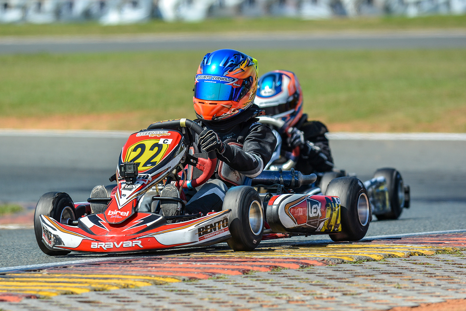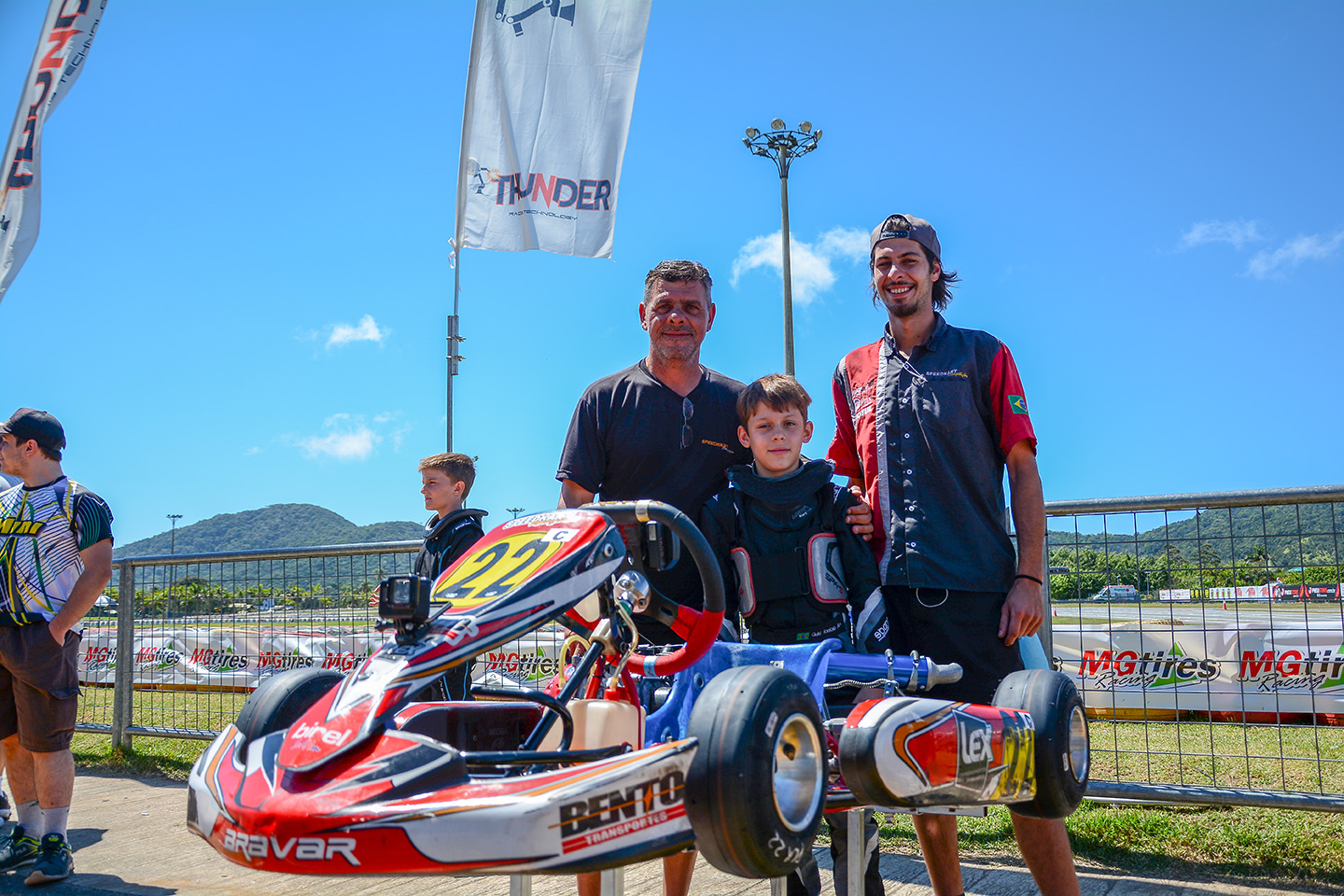Compartilhar no Facebook Compartilhar no Twitter Compartilhar no Google+ Compartilhar no Pinterest Largando do final do grid com 34 concorrentes, o piloto gaúcho conquista 14 posições na corrida decisiva da competição A primeira participação de Augusto Toniolo, o Guki, na Copa Brasil de Kart de Kart, realizada de 8 a 12 de outubro, no kartódromo Beto Carrero em Penha-SC, foi marcada por susto e superação. Com pouco mais de cinco meses de atuação no kartismo, Guki Toniolo teve um acidente na primeira prova classificatória, saiu de penúltimo do grid na corrida Final e encerrou na 19ª posição entre 34 concorrentes do país inteiro. Paulo e Renan Sodré ao lado de Guki Toniolo na Copa Brasil de Kart Guki Toniolo se envolveu em um acidente forte, que o tirou da primeira bateria classificatória faltando três voltas para o final, felizmente, sem nenhum ferimento. Na segunda bateria fez uma prova regular administrando a posição. O resultado do abandono e um 28º lugar colocou o piloto na última fila do grid da Cadete. Guki Toniolo largou bem e foi conquistando posições até receber a bandeira quadriculada em 19º lugar. “Para um piloto estreante e que está há cinco meses participando de corridas oficiais de kart consideramos bom o resultado. Talvez, se não fosse o abandono ele teria encerrado em uma melhor posição. Como o objetivo neste ano é adquirir conhecimento, prática e desenvolver as habilidades dele foi uma ótima experiência. Estamos preparados para todos os outros desafios que ainda virão pela frente”, comentou Paulo Sodré, preparador do piloto. Texto e fotos: Eni Alves
