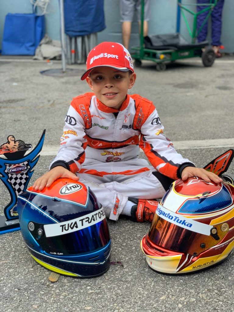Compartilhar no Facebook Compartilhar no Twitter Compartilhar no Google+ Compartilhar no Pinterest Jovem piloto de apenas 8 anos encerra temporada de conquistas com dois títulos estaduais e três vices nacionais na categoria Mirim Augustus com o capacete que ganhou dos pais de Tuka Rocha e outro em homenagem ao piloto que foi o seu coach. Competindo no kart há menos de 2 anos, Augustus Toniolo é uma das grandes esperanças do Brasil no futuro da modalidade. No último sábado, em Interlagos, o piloto paranaense foi campeão da Copa Interlagos de Kart, completando uma temporada recheada com várias outras conquistas: vice-campeão brasileiro, campeão paranaense, vice-campeão da Copa Brasil e vice-campeão do Open Brasileiro. “Estou bem feliz pelo título da Copa Interlagos, é muito especial ser campeão nessa pista por onde passaram grandes nomes do automobilismo, como Ayrton Senna. Largamos em segundo lugar na primeira corrida e liderei a prova praticamente toda desde a primeira volta. Foi uma pena que levei um toque na traseira de forma absurda na última volta e isso entortou o nosso chassi. Ainda terminei em quinto lugar essa e mais uma outra corrida, mas infelizmente o kart perdeu rendimento depois de ter levado essa batida. Ainda bem que tinha uma boa margem na liderança do campeonato”, diz Augustus. Para fechar o final de semana de muita emoção, o jovem piloto de apenas 8 anos ganhou um capacete das mãos do pai de Tuka Rocha (Antonio Sergio), piloto que faleceu no mês passado. Tuka foi coach de Augustus nesse seu início de carreira e ajudou na formação do piloto também na Escola de Kart do Senninha. “O Tuka foi muito importante e especial para mim. Vou levar o legado dele para todas as pistas em que eu for competir. Corri com o número 25 na frente do kart e com a mensagem ‘Obrigado Tuka’ na viseira para homenageá-lo. Foi bem emocionante ganhar o capacete das mãos do pai dele e vou guardar com muito carinho em casa”, completou Augustus, que corre na categoria Mirim. Augustus retornará às pistas no início de janeiro de 2020, com foco em disputar o Troféu Ayrton Senna de Kart entre os dias 21 e 25 do mesmo mês.