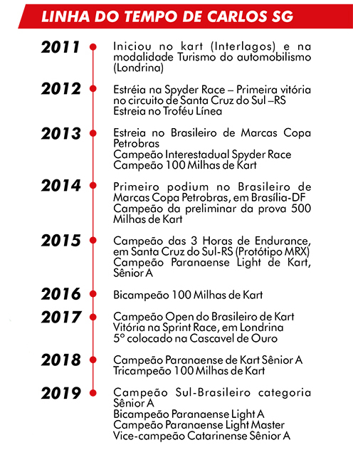 Compartilhar no Facebook Compartilhar no Twitter Compartilhar no Google+ Compartilhar no Pinterest Brasileiro de Marcas (foto: Rodrigo Ruiz) Aos 41 anos, quatro títulos de campeão e um vice conquistados no Kart em 2019, o piloto londrinense Carlos SG abre o jogo sobre a sua vida no automobilismo. Como tudo começou, vitórias, frustrações, saiba tudo nesta entrevista dada para a jornalista Eni Alves, da revista Podium. ENI: Uma curiosidade, o seu nome é Carlos Eduardo de Souza e o seu codinome é Carlos “SG”, de onde vem o G?CARLOS SG: O S é de Souza e o G de Gibim, nome da minha empresa Souza & Gibim, SG. ENI: Quando aconteceu o “start” para o automobilismo?CSG: Foi em 2011. Comecei a treinar de kart e na sequência patrocinei um piloto no Troféu Línea. Isso me aproximou dos autódromos e despertou o meu interesse pelo esporte. RP: Como e onde foi a sua estreia?CSG: Foi em 2011 mesmo. Em Interlagos no Kart, e em Londrina estreei no volante de um Gol, em uma etapa do Campeonato Paranaense de Marcas. ENI: Por quais categorias você já passou?CSG: Fiz algumas provas de Turismo 1600 em Campeonatos de Marcas e Pilotos. Fui campeão Interestadual de Spyder Race em 2012, passei pelo Troféu Línea, Brasileiro de Turismo pela Stock Light, fiz corridas de Endurance com protótipos, participei da Cascavel de Ouro, do Brasileiro de Marcas com carros da Ford, Honda e Chevrolet, fiz etapas da Sprint Race, e em 2019 disputei campeonatos de Kart. Conquistei títulos de campeão pela categoria Sênior A no Sul-brasileiro, Paranaense, Paranaense Light A e Master, e sou vice-campeão Catarinense. ENI: Qual foi o melhor momento na sua carreira até agora?CSG: Foram muitas. Tive grandes atuações no Brasileiro de Marcas em 2016 e 2017, na Copa Petrobras. Mas a vitória em casa… (emoção). O motor do carro apresentava um barulho estranho, parecia que iria quebrar a qualquer momento. Estávamos no último treino livre e trocá-lo naquele momento, significaria ficar sem fazer a tomada de tempo. O Juan Carlos Lopes, chefe da Micos Racing, estava no box nos visitando, chegou em mim e disse: – Cara, acelera se quebrar quebrou, vai fazer a pole e ganhar com esse motor, não vamos ficar em último – a pole não veio. Fiz um P2. Larguei e fiz uma das melhores e importante ultrapassagem em cima do P1 da minha vida. O meu pai estava lá, o Sr. Gradin. O líder era o Gabriel Casagrande e eu ganhei a corrida. No podium eu em P1, Casagrande em P2 e Luiz Razia em P3, fraco né? (Risos) ENI: E o pior?CSG: Sem dúvidas, o segundo semestre de 2014. O primeiro semestre foi bom, mas alguns problemas na equipe não me permitiram ser competitivo no segundo, isso me decepcionou muito. ENI: É melhor pilotar carro ou kart?CSG: Quem é piloto sabe bem. Pra gente tudo no automobilismo é gostoso. Kart é uma paixão, você não para nunca, sempre é bom andar. Já o carro, no meu caso, é um desafio. Tento levar a experiência do dia a dia do kart para ter um bom resultado no carro. Pilotar num Autódromo é sensacional!Sul-brasileiro de kart em Londrina-PrCatarinense de Kart em Florianópolis-SCCampeão sul-brasileiro de kart 2019 ENI: Existe um desejo de participar de alguma categoria ainda?CSG: Nunca guiei um carro na categoria GT. Quem sabe um dia… ENI: O que significa “estar no automobilismo” para o Carlos SG?CSG: Significa estar onde eu gosto, fazendo o que gosto, convivendo com o meu sonho. ENI: Quem é o seu ídolo no esporte?CSG: Rubens Barrichello ENI: Qual era a meta traçada para a temporada 2020?CSG: O objetivo, antes da pandemia, era disputar a Copa do Brasil de Kart, Brasileiro de kart, o Mundial de Kart… e me divertir nesses campeonatinhos (risos). Agora vamos ver como ficará o calendário das competições. ENI: Como consegue conciliar trabalho e família com o calendário apertado do kart?CSG: Não é nada fácil. O trabalho ainda levo comigo para onde vou, o whatsap comercial e emails rolam o tempo todo. Com a família… eu abuso um pouco da paciência das minhas duas filhas e da esposa, mas sempre que podem estão me acompanhando. ENI: Você acompanha o kart também quando não está competindo. Para você, quem é a piloto revelação dos últimos anos?CSG: Caio Collet e Pietro Fitipaldi. Eles fizeram um bom trabalho no kart, estão representando muito bem o Brasil lá fora e acredito que está chegando a vez deles. ENI: Que mensagem você gostaria de deixar para estee pilotos?CSG: Push Push Push ou seja, ACELERAAAAAA Linha do tempo de Carlos SG Fotos de Rodrigo Ruiz, Eni Alves e arquivo pessoal do piloto