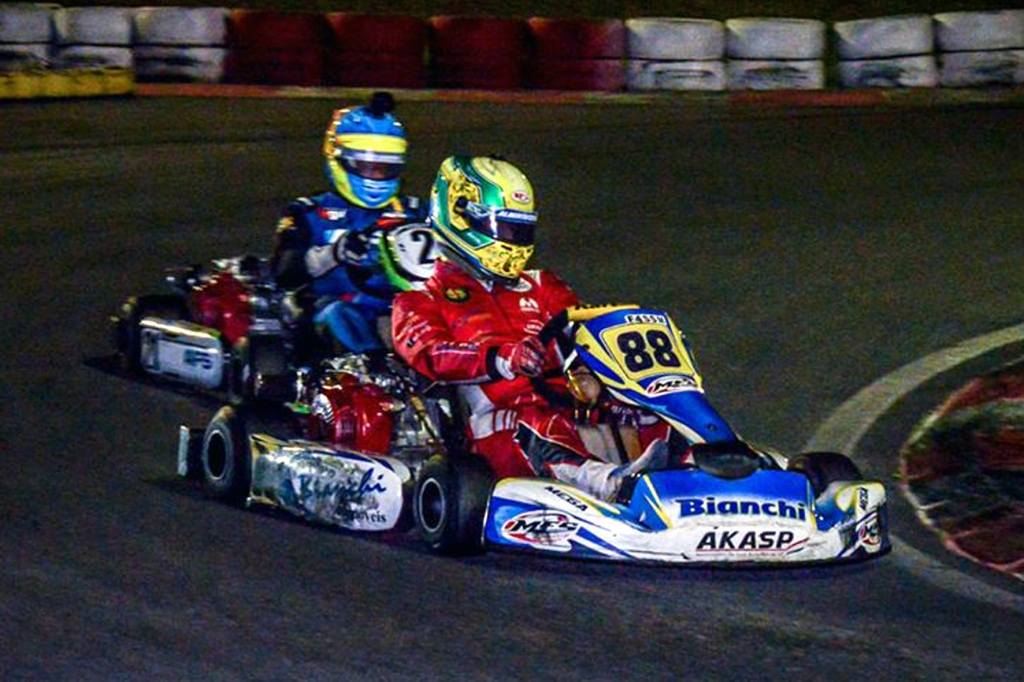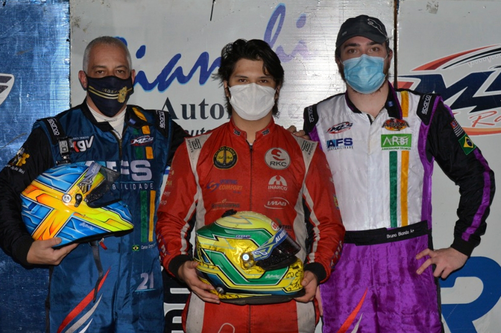 Compartilhar no Facebook Compartilhar no Twitter Compartilhar no Google+ Compartilhar no Pinterest Alberto Otazú largou em sexto, na 12ª volta assumiu a liderança e na chuva disparou na frente O vencedor Alberto Otazú, ladeado por Carlos Santana (E) e Bruno Biondo (D) (Foto: Pedro Bragança) Em uma prova brilhante, o piloto Alberto Otazú (Cardoso Funilaria e Pintura/Bianchi Automóveis/AVSP/No Fire Services/Rolley Ball/Speed Truck/Pailler Racing) venceu pela terceira vez na temporada 2020 de F-4 da Associação de Kart Amador de São Paulo (Akasp). Desta vez foi na sexta etapa do terceiro turno do certame monomarca, realizada na noite de quarta-feira (29/7) no Kartódromo Granja Viana, em Cotia (SP). “Foi uma boa vitória. Tive que ser extremamente agressivo na primeira volta e depois que assumi a liderança fui muito pressionado. Agora, quando começou a chover, eu me senti aliviado, pois consegui abrir uma vantagem muito grande, apesar de levar um susto com a rodada de um piloto logo na minha frente na última volta”, comemorou Otazú, que recebeu a bandeirada com 14s417 de vantagem sobre Bruno Biondo (Arbi), e 19s701 à frente de Carlos Santana (AFS), o terceiro colocado. A prova começou com Giovani Bondança largando na ponta, seguido de Emerson Rildo. Partindo da sexta posição Alberto Otazú já fechou a primeira volta no terceiro posto. No terceiro giro, Otazú aparecia em segundo, e três passagens depois Carlos Santana era o terceiro. No final da 12ª passagem Otazú ultrapassou Bondança para assumir a ponta, levando Santana em seu encalço. Otazú permaneceu na liderança, mas com Santana, que tinha estabelecido a volta mais rápida, embutido na sua traseira, da 15ª até a 24ª passagem, quando começou a chover. Enquanto Santana rodava, Otazú ampliava a sua vantagem, controlando muito bem o seu Mega/Honda com pneus slicks no piso molhado. Enquanto isto, Biondo aproveitava o asfalto escorregadio para subir para quarto no 24º giro, terceiro cinco voltas depois, e garantir a vice-liderança na derradeira passagem, com nova rodada de Santana. “Eu consegui controlar bem o meu kart na chuva, e abri uma boa vantagem sobre todos, que só não foi maior porque perdi sete segundos desviando de um companheiro que rodou logo na minha frente, justamente na última volta. Foi um susto, pois apesar da minha enorme folga, se eu batesse poderia abandonar a corrida. Por isto estou feliz com a minha terceira vitória neste ano, pois foi suada e molhada!”, comentou o vencedor do primeiro turno, ao lado de seu parceiro Hélio Bianchi. Alberto Otazú já venceu três provas de F-4 neste ano (Foto: Pedro Bragança) O certame de F-4 da Akasp é disputado com karts Mega dos próprios pilotos, mas com acertos de chassi fixos, equipados com motor Honda GX 390, de 18 hp, equalizados e sorteados pela MFS Racing. A novidade desta temporada é a utilização dos pneus Lecont. A sétima etapa do terceiro turno da F-4 da Associação de Kart Amador de São Paulo será realizada no dia 5 de agosto, novamente no Kartódromo Granja Viana. Confira o resultado da sexta etapa do terceiro turno da F-4 Akasp: 1) Alberto Otazú, 30 voltas em 20min28s254; 2) Bruno Biondo, a 14s417; 3) Carlos Santana, a 19s701; 4) Giovani Bondança, a 27s458; 5) Alexandre Albino, a 27s495; 6) Arnaldo Biondo, a 36s966; 7) Saint Clair, a 2 voltas; 8) Rogério Cebola, a 2 voltas; 9) Luiz Reche, a 2 voltas; 10) Emerson Rildo, a 3 voltas. Classificação do terceiro turno da F-4 Akasp depois de seis etapas (com descarte): 1) Emílio Di Bisceglie/Bruno Biondo, 130 pontos; 2) Carlos Santana, 124; 3) Alberto Otazú/Hélio Bianchi, 109; 4) Alexandre Albino, 94; 5) Rogério Cebola/Alberto Otazú, 92; 6) Otávio Lotfi, 88; 7) Emerson Rildo, 87; 8) Sérgio Luis Gonçalves /Dilson Sucupira, 86; 9) Arnaldo Biondo/Bruno Biondo/Emílio Di Bisceglie, 86; 10) Luiz Reche/André Relvas, 70. Classificação Extra-oficial da F-4 da Akasp depois de dez etapas (Referência): 1) Emílio Di Bisceglie/Bruno Biondo, 286 pontos; 2) Alberto Otazú/Hélio Bianchi, 279; 3) Otávio Lotfi, 215; 4) Carlos Santana, 213; 5) Alberto Otazú/Rogério Cebola, 211; 6) Alexandre Albino, 195; 7) Bruno Biondo/Arnaldo Biondo/Emílio Di Bisceglie, 194; 8) Sérgio Luiz/Dilson Sucupira, 186; 10) Heraldo Brasil/Saint Clair, 175; 10) Luiz Reche/André Relvas, 171. Alberto Cesar Otazú tem o apoio de Autódromo Virtual de São Paulo (AVSP), Bianchi Automóveis, Cardoso Funilaria e Pintura, No Fire Services, Rolley Ball, Speed Truck, Pailler Racing. O jovem apoia as ações da Associação Cruz Verde, Direção para a Vida e Rotary Club Ponte Estaiada. Visite www.akasp.com.br Acompanhe www.facebook.com/albertocesar.otazu Curta www.facebook.com/associacaocruzverde Curta www.facebook.com/DirecaoParaAVida Visite www.nofire.com.br Visite www.rolleyball.com.br Visite www.paillerracing.com.br Visite www.speedguincho.com.br