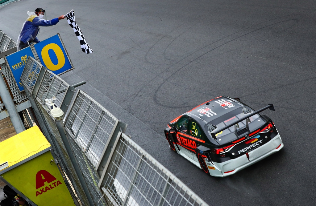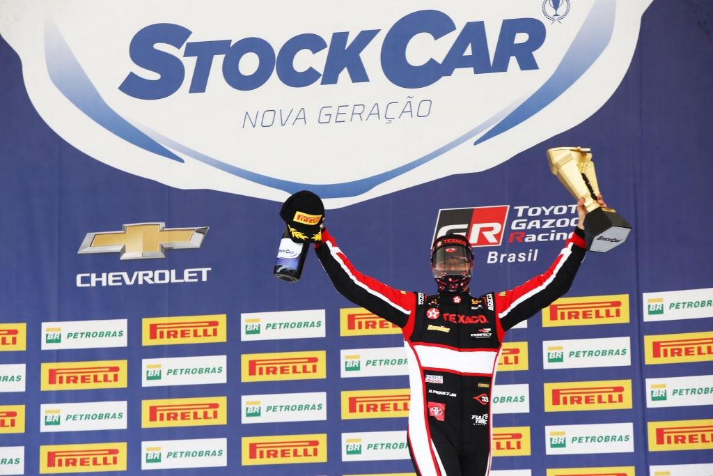 Compartilhar no Facebook Compartilhar no Twitter Compartilhar no Google+ Compartilhar no Pinterest Piloto da equipe Texaco Full Time Sports larga em segundo, consegue liderança da prova antes do pit stop e abre quase seis segundos de vantagem para vencer na pista paulista. Neste domingo, será disputada a Corrida do Milhão Solidário Nelsinho Piquet comemora primeira vitória na Stock Car (Luca Bassani) A vitória estava “engasgada”, como o próprio Nelson Piquet Jr. descreveu, mas ela veio de forma emocionante neste sábado (22) na disputa da segunda etapa da temporada 2020 da Stock Car, realizada no autódromo José Carlos Pace, em Interlagos (SP). Depois de conquistar o segundo lugar no grid, algumas horas antes da corrida, o piloto da Texaco Full Time Sports fez uma prova perfeita para chegar a sua primeira vitória na categoria, cruzando a linha chegada com quase seis segundos de vantagem para o segundo colocado, o gaúcho Cesar Ramos, que havia largado na pole position. Ricardo Zonta completou o pódio, em terceiro. Apesar do frio e da garoa que caiu pela manhã na pista paulista, a vitória aqueceu a comemoração da equipe Full Time, que também venceu pela primeira vez em Interlagos, a única pista do calendário onde o time de Maurício Ferreira ainda não havia triunfado em seus 16 anos de Stock Car. A disputa deste sábado começou com Safety Car e pista úmida, com os pilotos usando pneus de chuva em seus carros. Mas o asfalto foi secando e levou a maioria dos pilotos à mudança para pneus slicks no pit stop obrigatório. Piquet conseguiu ultrapassar Cesar Ramos pouco antes da sua parada, quando faltavam 21 minutos para o encerramento da prova. No pit, a equipe Full Time trabalhou rápido, realizou a troca para pneus slick, e Piquet saiu novamente na frente do rival. Piloto da Texaco Full Time recebe a bandeirada em Interlagos (Luca Bassani) “Essa vitória estava engasgada há algum tempo. Mas, finalmente, hoje deu tudo certo. Nos classificamos bem e fizemos uma estratégia muito boa. Consegui cuidar bem dos pneus nas primeiras voltas, pois sabíamos que a pista estava secando. Os pneus do Cesinha (Cesar Ramos) começaram a aquecer e eu consegui ultrapassa-lo e entrei no pit em primeiro”, contou o piloto do Corolla #33. “A equipe fez uma estratégia excelente, colocando os pneus slick. As primeiras voltas foram difíceis com esses pneus, porque eles ainda estavam frios e a pista úmida. Mas conseguimos manter o carro bem na pista e ele estava muito rápido”, lembrou Piquet, que na primeira etapa em Goiânia, no mês passado, já havia subido ao pódio, com um segundo lugar na corrida 2, após largar dos boxes. “Começamos o ano muito bem. Em Goiânia, não fosse a quebra do semieixo na corrida 1, eu estaria melhor ainda no campeonato. Mas temos um carro muito bom e velocidade para brigar pelo título. Gostaria de agradecer novamente à Texaco, à Toyota e à Full Time. Este ano promete e estou bem preparado para tentar brigar pelo campeonato”, completou Piquet, que agora soma seis pódios na Stock Car, em três temporadas. Com os resultados, a briga pela ponta está bastante acirrada. Zonta, Rubens Barrichello (sétimo neste sábado) e Ramos dividem a liderança, com 52 pontos. Mas Piquet vem logo atrás, com 50. O que aumenta ainda mais as expectativas para este domingo (23), quando será realizada a terceira etapa da temporada, com a Corrida do Milhão Solidário. O grid para a corrida – que este ano terá seu prêmio concedido na forma de doações direcionadas a entidades que combatem a pandemia do coronavírus – será definido às 8h15 (ao vivo no SporTV). A largada da prova, que terá a disputa de 40 minutos e mais uma volta – acontecerá às 10h10 (ao vivo na TV Globo). Neste fim de semana, o Fan Push valerá apenas para a Corrida do Milhão e todos os pilotos estarão habilitados. Piquet, que já recebeu o apoio extra dos fãs em Goiânia, poderá novamente concorrer. Para votar no piloto, acesse: www.stockcar.com.br/fanpush . A votação vai até a manhã deste domingo. Resultado extra-oficial da segunda etapa: 1. Nelson Piquet Jr (Texaco Full Time Bassani – Corolla) – 21 voltas em 41min44s797 2. Cesar Ramos (Ipiranga Racing – Corolla) – a 5.833 3. Ricardo Zonta (RCM Motorsport – Corolla) – a 6.641 4. Rafael Suzuki (Full Time Bassani – Corolla) – a 7.611 5. Ricardo Mauricio (Eurofarma-RC – Cruze) – a 8.194 6. Gabriel Casagrande (R. Mattheis Motorsport – Cruze) – a 9.752 7. Rubens Barrichello (Full Time Sports – Corolla) – a 9.860 8. Gaetano di Mauro (Vogel Motorsports – Cruze) – a 10.796 9. Allam Khodair (Blau Motorsport – Cruze) – a 11.723 10. Bruno Baptista (RCM Motorsport – Corolla) – a 11.825 11. Lucas Foresti (Vogel Motorsports – Cruze) – a 17.282 12. Átila Abreu (Shell V-Power – Cruze) – a 17.602 13. Daniel Serra (Eurofarma-RC – Cruze) – a 17.672 14. Diego Nunes (Blau Motorsport – Cruze) – a 18.551 15. Galid Osman (Shell V-Power – Cruze) – a 19.564 16. Cacá Bueno (Crown Racing – Cruze) – a 23.101 17. Vitor Baptista (KTF Sports – Cruze) – a 24.531 18. Julio Campos (Crown Racing – Cruze) – a 26.538 19. Denis Navarro (Cavaleiro Sports – Cruze) – a 28.099 20. Guilherme Salas (KTF Sports – Cruze) – a 42.773 21. Tuca Antoniazi (Hot Car Competições – Cruze) – a 43.915 22. Thiago Camilo (Ipiranga Racing – Corolla) – a 46.926 23. Marcos Gomes (Cavaleiro Sports – Cruze) – a 53.299 24. Matias Rossi (Full Time Sports – Corolla) – 4 voltas 25. Pedro Cardoso (R. Mattheis Motorsport – Cruze) – a 10 voltas Classificação do campeonato (Top-10): 1 Rubens Barrichello (Full Time Sports/Corolla), 52 Ricardo Zonta (RCM Motorsport/Corolla), 52 Cesar Ramos (Ipiranga Racing/Corolla), 52 4 Nelson Piquet Jr (Texaco Full Time Bassani/Corolla), 50 5 Ricardo Maurício (Eurofarma-RC/Cruze), 47 6 Daniel Serra (Eurofarma-RC/Cruze), 42 7 Allam Khodair (Blau Motorsp