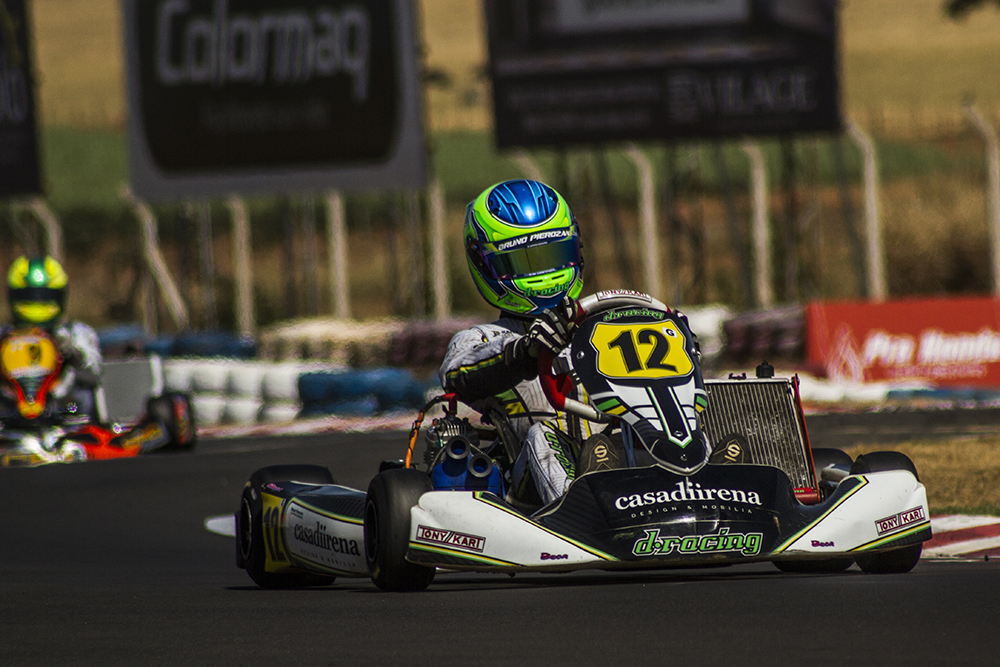 Compartilhar no Facebook Compartilhar no Twitter Compartilhar no Google+ Compartilhar no Pinterest Preparação para o Brasileiro de Kart de 2020 começou de forma positiva em sábado de sol intenso em Birigui. Em seu ano de estreia na categoria Graduados, Bruno Pierozan (Casa Di Irena / D.Racing) vem ocupando seu lugar de destaque entre os competidores da categoria mais competitiva do kartismo nacional, quando garantiu a terceira posição na etapa de abertura da Copa Speed Park no último sábado, na retomada da sua preparação para o Campeonato Brasileiro de Kart, que devido a pandemia do Covid-19, terá realização no final do ano, em Birigui. Atual líder da Copa São Paulo Light de Kart na categoria Graduados B, Pierozan deu sequência na sua preparação para a competição mais importante do kartismo brasileiro desse ano, pista na qual o piloto da cidade de Vinhedo já colheu bons frutos no início do ano, no Troféu Ayrton Senna, quando marcou seu primeiro pódio na categoria. Vivendo dias de treinos com sol intenso, as atividades principais da etapa tiveram início na manhã de sábado, quando o piloto obteve a marca do sexto tempo na tomada de tempo. Já para as corridas, um terceiro e quarto lugar nas provas, resultaram no terceiro lugar do pódio, e 15 pontos na classificação neste início de campeonato. “Fazer pódio sempre é bom, mas o importante dessa etapa de Birigui foi testar o meu preparo físico nessa pista que além de técnica, exige muito do equipamento e do preparo físico do piloto, com curvas com mais de 3G de aceleração lateral. Com temperatura acima de 35 graus, as provas da Graduados ocorreram no final da manhã, exigindo muita resistência física sob o intenso sol do meio-dia. Quanto ao desempenho do kart, trabalhamos bastante desde os treinos. O kart perdeu rendimento no final da primeira bateria e decidimos fazer uma alteração para a segunda corrida. Cheguei a disputar a liderança da corrida nas primeiras voltas, e me mantive entre os três primeiros ao longo de toda a corrida. Ao final da prova, chegando à exaustão física devido ao intenso calor, consegui manter a quarta posição.” – ressaltou Bruno, que segue co nfiante no trabalho preparatório para o Brasileiro de Kart, em busca do primeiro título nacional. O piloto de 15 anos retorna as pistas em Interlagos, para a 6ª Etapa da Copa São Paulo Light de Kart nos dias 10, 11 e 12 de Setembro, em busca de bons resultados, defendendo a liderança da Graduados B. Acompanhe o piloto Bruno Pierozan no Instagram: instagram.com/brunopierozan12 Fotos: Jackson de Souza