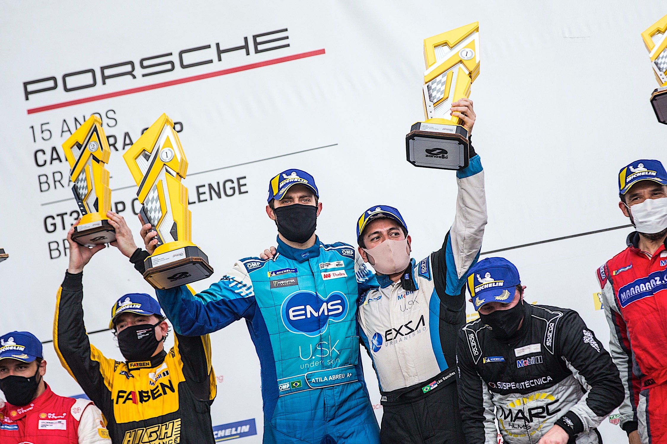 Velocidade no Asfalto Átila Abreu e Léo Sanchez vencem na Porsche Endurance GT3 Sport em Goiânia Por Eni Alves Publicado em 26 de outubro de 2020 Compartilhar no Facebook Compartilhar no Twitter Compartilhar no Google+ Compartilhar no Pinterest Goiânia – Em uma prova recheada de estrelas do automobilismo mundial, Átila Abreu e Léo Sanchez brilharam e garantiram mais uma vitória na disputa da temporada endurance da Porsche GT3 Cup Sport, disputada na tarde deste sábado no Autódromo de Goiânia. Com o resultado, a dupla mantém a liderança no campeonato da categoria endurance, que tem ainda mais uma etapa para definir os campeões. Léo Sanchez voltou a celebrar vitória ao lado de Átila Abreu. Foto: Bruno Terena “Foi uma corrida um pouco mais difícil, com um ritmo forte, tanto que a diferença entre todos os líderes foi pequena. Mas conseguimos fazer uma prova limpa e garantir a liderança do campeonato”, comentou Léo Sanchez, colocando as marcas da EMS Farmacêutica, UsK Underskin e Exxa Urbanismo no lugar mais alto do pódio. A próxima etapa da categoria endurance do Porsche GT3 Cup está marcada para o dia 6 d edezembro, em Interlagos. Antes, no dia 14 de novembro, o autódromo paulista recebe a etapa da categoria Sprint. Resultado da prova Extra-oficial 1º – G.SALAS / P.Aguiar, após 79 voltas 2º – T.CAMILO / A.Feldmann, a 2.589 3º – L. DI GRASSI / R.Baptista, a 15.789 4º – F.MASSA / L.Kaesemodel, a 16 5º – W.NEUGEBAUER / R.Zonta, a 36.408 6º – N.PIQUET JR. / R.Ziemkiewicz, a 39.107 7º – A.HELLMEISTER / L.Seripieri, a 1:00.095 8º – S.JIMENEZ / R.Mello, a 1:02.175 9º – R.GUERRA / A.Auler, a 2 Laps 10º – R.REIS / Kreis.Jr., a 2 Laps 11º – C.RAMOS / Z.Feffer, a 2 Laps 12º – W.FREIRE / F.Horta, a 2 Laps 13º – Á.ABREU / L.Sanchez, a 2 Laps 14º – A.GAIDZINSKI / De.Dirani, a 2 Laps 15º – N.MARCONDES / N.Monteiro, a 2 Laps 16º – G.DI MAURO / G.Frangulis, a 2 Laps 17º – R.SUZUKI / L.Salles, 2 Laps 18º – F.CARBONE / P.Totaro, 2 Laps 19º – M.IORIO / R.Fontanari, a 3 Laps 20º – MAR.BILLI / Mau.Billi, 3 Laps 21º – E.MENOSSI / A.Darwich, a 3 Laps