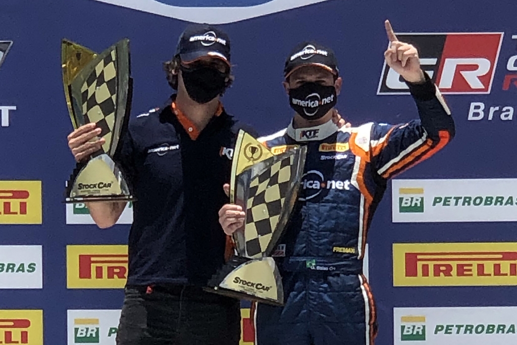 Velocidade no Asfalto KTF Sports conquista sua primeira vitória na Stock Car Por Eni Alves Publicado em 23 de novembro de 2020 Compartilhar no Facebook Compartilhar no Twitter Compartilhar no Google+ Compartilhar no Pinterest Guilherme Salas, em corrida brilhante, garantiu o alto do pódio em Goiânia CEO da KTF – Enzo Bortoleto e Gui Salas (Rodrigo Guimarães | KTF Sports) Terminou neste domingo (22) a 11ª etapa da Stock Car. Em sua recente história na categoria, iniciada apenas em 2019, a equipe paulista KTF Sports conquistou a sua primeira vitória com o piloto Guilherme Salas. Com uma estratégia de total prioridade para a primeira corrida de hoje, o piloto largou da segunda posição, assumiu a liderança na segunda volta e levou o carro #85 à linha de chegada na primeira colocação. O fim de semana da KTF Sports começou de forma excepcional já no sábado quando, em uma volta perfeita na classificação, Guilherme garantiu a pole-position e, Gaetano Di Mauro, a quarta colocação no grid. Na corrida única de ontem, com muita disputa, Salas cruzou a linha de chegada em segundo e Di Mauro, no oitavo lugar. A programação deste domingo foi iniciada com a sessão classificatória. Mais uma vez, à exemplo da etapa de sábado, a KTF conseguiu levar seus dois carros para o Q2. Nesta sessão, que definiu o grid de largada para a corrida, Salas garantiu a segunda posição com o tempo de 1m28s107e Di Mauro o nono lugar, com 1m28s339. A prova teve a sua largada autorizada pontualmente às 11 horas. Salas, mesmo pela parte de fora da pista, conseguiu se manter na segunda colocação enquanto que, Gaetano, subia dois postos, pulando para o sétimo lugar. Na segunda volta Salas fez uma manobra arrojada e colocou por dentro do líder Allan Khodair na curva zero assumindo, então a liderança da prova. A partir daí o piloto do carro #85 passou a imprimir um forte ritmo de corrida enquanto, seus adversários, brigavam pela segunda e terceira posições. Na oitava volta a janela de pit-stops foi aberta e Salas foi o primeiro a entrar para o seu procedimento obrigatório. Em duas trocas de pneus perfeitas a KTF devolveu Salas para a pista no primeiro lugar e Gaetano, em sétimo. Faltando ainda cerca de metade da primeira corrida os dois carros da KTF seguiram muito competitivos. Enquanto Guilherme abria distância na liderança, Di Mauro lutava para ganhar posições na zona de pontuação. Assim, ao final das 21 voltas, Guilherme Salas cruzou a linha de chegada confirmando a primeira vitória da equipe na Stock Car. Gaetano também terminou muito bem, em um comemorado sexto lugar. Sem muito tempo para comemorar a vitória, 20 minutos mais tarde os dois carros da KTF já estavam de volta ao grid para a segunda corrida. Nesta ocasião, porém, o time sabia que seria muito difícil alcançar a janela de pit-stops para reabastecimento uma vez que abriu mão disso na primeira prova. Com quatro voltas completadas acabou o combustível do carro de Gaetano e, exatamente na volta oito, quando a janela de pits foi aberta, acabou o combustível de Salas, sem que ele conseguisse chegar ao box. “Estou extremamente feliz com o resultado que conquistamos hoje. Fazem três corridas que encontramos um bom caminho e viemos aprimorando até chegarmos à pole-position e segundo lugar na corrida de ontem. A tão esperada primeira vitória da equipe veio hoje. Agradeço ao empenho e dedicação de todos os colaboradores do time, pilotos, mecânicos e engenheiros que estamos trabalhando juntos desde o ano passado. Aos nossos patrocinadores e todos que torcem pelo sucesso da KTF o meu sincero muito obrigado”, concluiu Enzo Bortoleto, CEO da KTF Sports. Fotos: Rodrigo Guimarães Assessoria de Comunicação da equipe KTF Sports Quick Comunicação e Marketing