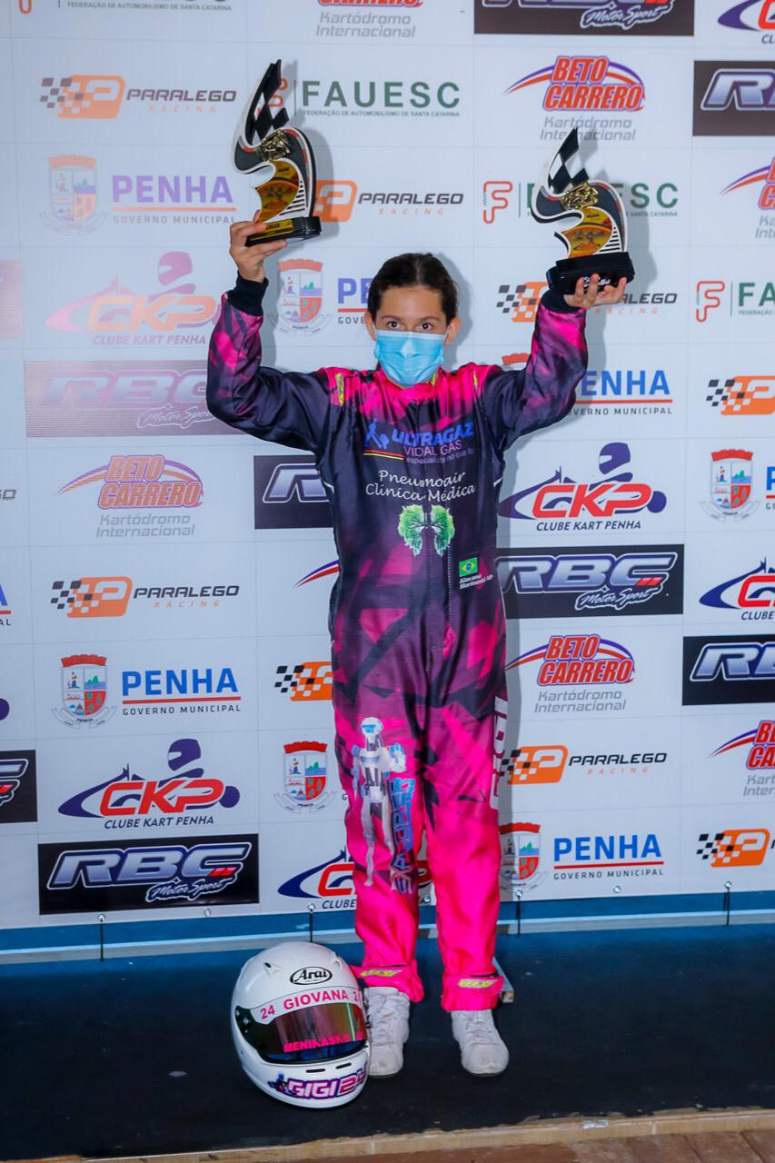 Compartilhar no Facebook Compartilhar no Twitter Compartilhar no Google+ Compartilhar no Pinterest A kartista paranaense conquistou o quarto lugar da categoria Cadete na prova disputada sábado no Kartódromo Beto Carrero World Giovana Marinoski conquistou o quarto lugar na etapa de abertura da CP Penha de Kart Crédito da foto: Gilmar Rose/Divulgação CURITIBA (PR) – A paranaense Giovana Krupp Marinoski teve excelente participação na etapa de abertura da Copa CK Penha de Kart, disputada sábado (10), no Kartódromo Beto Carrero World, em Penha, Santa Catarina. A kartista da equipe Clínica Pneumoair/Explorer Informática/Ananias Imóveis/MRcar/Distribuidora Parmera foi ao pódio ao conquistar o quarto lugar na categoria Cadete. Giovana saiu na quarta posição no grid de largada. Fez uma boa largada, mas antes de completar a primeira volta foi atingida por um concorrente que rodou à sua frente e caiu para 13º. Fez uma corrida de recuperação e conquistou o quarto lugar. Na segunda bateria, novamente conquistou o quarto lugar depois de acirradas disputas. Ela somou 26 pontos nas duas baterias, mas perdeu o terceiro lugar Francisco Camilo pelos critérios de desempates. “Estou feliz com o resultado por ter realizado uma prova segura. Depois de 40 dias sem competições, voltei à pista abaixo do peso. Tenho que agradecer ao preparador Cristiano Martins Freitas e ao seu auxiliar Henrique Novacowski, da Cris Racing, e a minha personal Luciana Guimarães Soluchinsky Cunha e a nutricionista Loriany de Paula pela dedicação e pelo trabalho que realizaram comigo”, acentua Giovana. A vitória foi de Paulo Willemann Filho, que somou 35 pontos. A data da 2ª etapa será confirmada nos próximos pela organização. Assessoria de imprensa da piloto Giovana Krupp Marinoski Jornalista Responsável: Luiz Aparecido da Silva