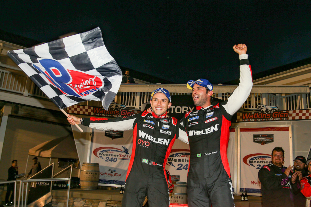 Velocidade no Asfalto Pipo Derani conquista 1ª vitória na temporada em Watkins Glen Por Eni Alves Publicado em 5 de julho de 2021 Compartilhar no Facebook Compartilhar no Twitter Compartilhar no Google+ Compartilhar no Pinterest Ao lado do companheiro Felipe Nasr, brasileiro tem noite épica no circuito do estado de Nova Iorque e vence após estratégia ousada da equipe Action Express nas paradas de box Muita comemoração para Pipo Derani (esquerda) e Felipe Nasr (Brian Cleary) A disputa da sexta etapa da temporada 2021 do IMSA WeatherTech SportsCar Championship, realizada na noite desta sexta-feira (2), em Watkins Glen, teve emoção do início ao fim, com chuva, bandeira vermelha e não poderia ter um desfecho melhor para o brasileiro Pipo Derani. Ao lado do companheiro Felipe Nasr, o piloto da equipe Action Express Racing conquistou uma grande vitória, após uma estratégia perfeita do time nas paradas de box com o #31 Whelen Engineering Cadillac DPi-V.R . Foi a nona vitória de Derani na categoria, a primeira na temporada 2021, depois de ficar bem próximo em Mid-Ohio e Detroit (quando terminou em segundo). Com o resultado, a dupla brasileira segue mais viva do que nunca na briga pelo título. Em terceiro lugar na tabela, eles estão mais próximos dos dois primeiros colocados. Derani iniciou a prova em quarto no grid e, com uma bela largada, assumiu a terceira posição na curva 2. O piloto se manteve na briga até parar no pit na volta 12, durante bandeira verde, para troca de pneus e reabastecimento. A equipe apostou numa estratégia diferente dos rivais, antecipando sua parada, na esperança de colocar o #31 Whelen Engineering Cadillac DPi-V.R na liderança. E a estratégia funcionou. Na volta 25, Derani assumiu a ponta e conseguiu abrir uma boa vantagem. Oito voltas depois, a equipe observou que um dos carros vinha lento na pista e decidiu antecipar a entrada do brasileiro para troca de pilotos, prevendo que a bandeira amarela seria acionada. Nasr voltou para a pista na quarta posição, mas logo na volta 37 a corrida foi interrompida com bandeira vermelha, em virtude do risco de raios na região. Foram 46 minutos com os carros parados nos boxes, mas o cronômetro rodando. Os pilotos só voltaram para a pista quando faltavam 40 minutos para o final da disputa. Com os outros carros DPi parando para troca de pneus e combustível ainda em bandeira amarela, Nasr já conseguiu sair na frente antes da bandeira verde ser acionada. O brasileiro manteve um ritmo forte, abriu vantagem, mas logo veio uma bandeira amarela, após um carro sair da pista. A relargada aconteceu quando faltavam 18 minutos para o final e Nasr seguiu acelerando forte para cruzar a linha de chegada em primeiro. “Foi um alívio”, destacou Derani. “Acredito que mostramos desde o início do ano que tínhamos um carro e uma equipe para vencer. Mas as coisas não saíram como gostaríamos em Daytona e Sebring. E vínhamos a cada corrida pensando: ‘é esta que iremos ganhar?’. Chegamos perto em Mid-Ohio, em Detroit. Agora, finalmente, vencemos”, comemorou o brasileiro. “A equipe fez um trabalho fantástico. Apostamos um pouco na estratégia e deu certo. Que pilotagem do Felipe no final! Foi maravilhoso para a equipe Whelen”, finalizou o paulista de 27 anos. A próxima etapa da temporada acontecerá entre os dias 6 e 8 de agosto em Road America. Confira o resultado em Watkins Glen (DPi): 1 #31 F. Nasr / P. Derani Whelen Engineering Racing Cadillac DPi 63 voltas em 2:41:27.882 2 #01 R. van der Zande / K. Magnussen Cadillac Chip Ganassi Racing +1.473 3 #10 R. Taylor / F. Albuquerque Konica Minolta Acura ARX-05 Acura DPi +10.315 4 #5 T. Vautier / L. Duval Mustang Sampling / JDC-Miller MotorSports Cadillac +12.025 5 #55 O. Jarvis / H. Tincknell Mazda Motorsports Mazda +12.446 6 #60 D. Cameron / O. Pla Meyer Shank Racing w/Curb-Agajanian Acura DPi +15.107 Fernanda Gonçalves
