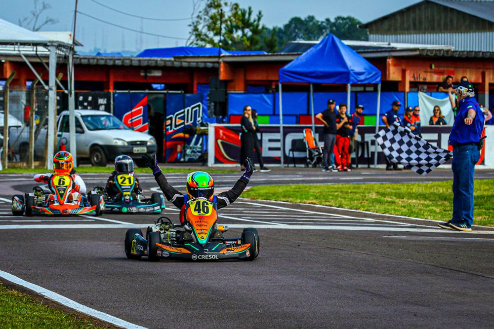Compartilhar no Facebook Compartilhar no Twitter Compartilhar no Google+ Compartilhar no Pinterest Piloto catarinense conquistou seu quarto título na carreira, o primeiro em caráter nacional Angelo Pegoraro Predebon comemora o título em Tarumã (Gilmar Rose) O Kartódromo de Tarumã, em Viamão, na Grande Porto Alegre (RS), certamente ficará guardado na memória de Angelo Pegoraro Predebon (Cresol | Dicave Volvo | OPS App) por muitos anos. No último final de semana, entre 13 e 15 de maio, com direito a estabelecer o novo recorde da pista para sua categoria, o piloto catarinense comemorou seu primeiro título nacional após conquistar um segundo lugar e duas vitórias no 25º Campeonato Sul-Brasileiro de Kart. O piloto, de apenas 8 anos, competiu na Mirim, que teve suas três provas disputadas em conjunto com a Cadete, uma categoria acima da sua e com pilotos com mais idade e mais tempo de carreira. Pole position na classificação geral, Angelo Pegoraro Predebon não fez uma boa largada na primeira bateria e perdeu posições, algumas delas recuperadas para terminar em segundo na Mirim. Na segunda corrida Angelo Pegoraro Predebon fez boa largada e, depois de travar bons duelos com os concorrentes, recebeu a bandeirada em terceiro na classificação e em primeiro na Mirim. E na prova decisiva, que oferecia pontos em dobro, o piloto de Xaxim (SC) teve sua melhor atuação. Largando em quarto, ele caiu para sétimo, recuperou-se e na última volta fez dupla ultrapassagem sobre Guilherme Moleiro e Nicolas Guth, pilotos da Cadete, para vencer na Mirim e na geral. Assim, com 11 pontos de vantagem, Angelo Pegoraro Predebon (Cresol | Dicave Volvo | OPS App) sagrou-se campeão sul-brasileiro pela primeira vez em sua ainda curta carreira, título que se junta aos da Copa SPR Light, Campeonato Catarinense, Copa Super Paraná e ao vice-campeonato gaúcho, todos conquistados em 2021. “Foram vários dias de treino, esforço e dedicação para alcançar todos estes ótimos resultados que me levaram ao título no Sul-Brasileiro”, vibrou Angelo Pegoraro Predebon após receber seu troféu de campeão em Tarumã. “Quero agradecer a todos que ajudaram na conquista, principalmente a meus patrocinadores, minha equipe, a Quirino Racing, e minha família”, completou. Além de ter conquistado um título inédito, Angelo Pegoraro Predebon saiu do Rio Grande do Sul como o novo recordista do Kartódromo de Tarumã em sua categoria, com o tempo de 46.609. “Tudo isso se deve muito à nova parceria que temos com a Techspeed”, aponta Cássio Predebon, pai de Angelo. “O novo chassi teve excelente desempenho e será utilizado em nossos próximos compromissos, na Copa São Paulo Light e na Copa Brasil”, emendou. Líder da Copa SPR Light e quarto colocado na Copa São Paulo Light, Angelo Pegoraro Predebon tem como principal foco a disputa da 23ª edição da Copa Brasil, que será realizada em julho, em Aracaju (SE), e o Campeonato Brasileiro, em Itu, em outubro. Para saber mais sobre a carreira de Angelo Pegoraro Predebon acompanhe o Instagram @angelo_46_. KG COM Assessoria de Comunicação – Erno Drehmer