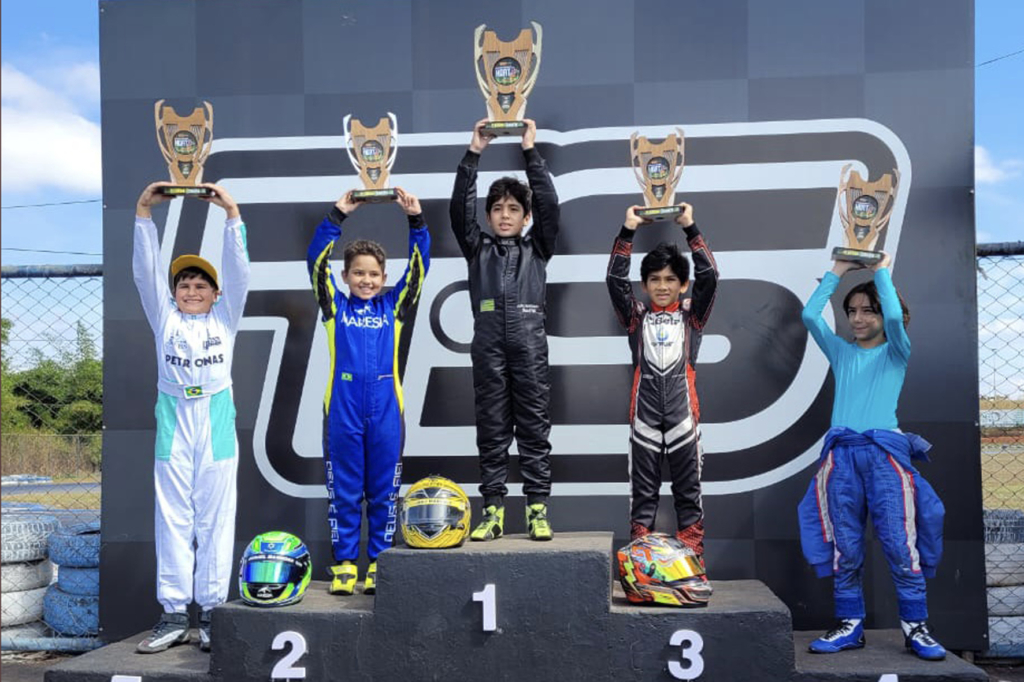 Compartilhar no Facebook Compartilhar no Twitter Compartilhar no Google+ Compartilhar no Pinterest Japa Voador de Goiás, foi terceiro colocado nas duas provas finais da Cadete Pablo Hattori elogiou o kart da Sprayercom/WC Racing O piloto Pablo Hattori (Sprayercom/WC Racing) conquistou no último sábado (11/6) o título de Campeão da Copa Goiás de Kart, na categoria Cadete. Na quarta rodada dupla do certame, disputada Kartódromo Ricardo Santos, em Goiânia (GO), ele acumulou dois terceiros lugares, que somados com as cinco vitórias nas etapas anteriores foram suficientes para que ele comemorasse a conquista. “Estou contente por este título, que não foi fácil, venci por apenas três pontos de vantagem. Apesar de vir de uma sequência de cinco vitórias, hoje foi meio complicado, mas no fim deu pra ser campeão”, comemorou o piloto goiano de apenas 10 anos de idade, que somou 109 pontos, contra 106 de João Marcelo de Azevedo. A quarta rodada da Copa Goiás e do Campeonato Goiano de Kart teve muitas disputas e até acidente e polêmica na categoria Cadete. No fim, João Marcelo de Azevedo, Miguel Barbosa e Pablo Hattori chegaram nesta ordem nas duas baterias e ocuparam as três primeiras posições do pódio. “Tive que trocar de motor nos treinos e o segundo que peguei também era fraco. O chassi preparado pelo Wellington (Castro) estava bom, mas eu não tinha motor para acompanhar os ponteiros”, comentou Pablo Hattori. Pódio da 4ª rodada da Copa Goiás (Foto: Daiane Cristina) Com um motor com rendimento abaixo das expectativas, Pablo Hattori fez o quarto tempo na tomada de tempos, a 0s226 de João Marcelo de Azevedo, o pole position. Na largada da primeira prova ele foi tocado por um concorrente de outra categoria na primeira curva e rodou, caindo para o 12º posto. A partir daí, o ‘Japa Voador de Goiás’ empreendeu um bom ritmo e após alcançar o pelotão foi efetivando várias ultrapassagens, até receber a bandeirada em sexto, lado a lado com o quinto colocado. Após a prova, Leonardo Muniz foi punido e Pablo ficou com a quinta colocação, mas terceiro na Cadete. “É um problema correr junto com outra categoria com bons pilotos, mas com menos experiência, e com equipamento mais leve que acabam equalizando os tempos. Isto acaba prejudicando as disputas dentro do campeonato de cada categoria”, desabafou o piloto da Sprayercom/WC Racing. Largando em quinto na segunda bateria, Pablo logo assumiu a quarta posição, mas um acidente interrompeu a competição. Na relargada, em fila indiana, o pequeno Hattori tentou correr atrás do prejuízo e na oitava volta assumiu o terceiro posto. A partir da 11ª volta começou a trocar de posição para voltar a se reafirmar em terceiro na penúltima passagem. No entanto, com o vácuo ele perdeu a posição na linha de chegada, recebendo a bandeirada em quarto, a 63 centésimos de segundo de Miguel Barbosa, mas terceiro entre os pilotos da Cadete. A quinta etapa do Campeonato Goiano de Kart, que abrira a Copa Centro-Oeste, será realizada dia 27 de agosto, em Rio Verde (GO). Resultado da 7ª etapa do Campeonato Goiano e Copa Goiás de Kart: 1) Theo Naves, 14 voltas em 10min42s753; 2) João Marcelo de Azevedo, a 0s146; 3) Gabriel Thomaz, a 3s213; 4) Miguel Barbosa, a 6s197; 5) Leonardo Muniz, 6s476; 6) Pablo Hattori, a 6s524; 7) Felipe Grando, a 7s090; 8) Luis Felipe Machado, a 7s154; 9) Enzo Thomaz, a 14s343; 10) Luis Felipe Queiroz, a 14s350. Resultado da 8ª etapa do Campeonato Goiano e Copa Goiás de Kart: 1) Theo Naves, 14 voltas em 11min54s545; 2) João Marcelo de Azevedo, a 0s164; 3) Miguel Barbosa, a 0s178; 4) Pablo Hattori, a 0s241; 5) Gabriel Thomaz, a 0s335; 6) Heitor Samora, a 7s752; 7) Luiz Felipe Queiroz, a 9s034; 8) Enzo Thomaz, a 11s998; 9) Theo Morgado, a 12s077; 10) Leonardo Muniz, a 13s925.