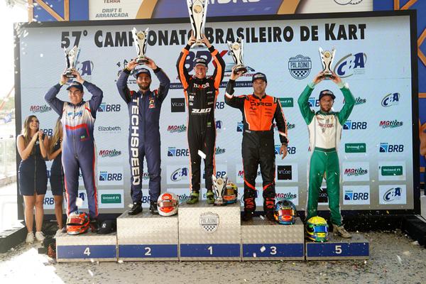 Compartilhar no Facebook Compartilhar no Twitter Compartilhar no Google+ Compartilhar no Pinterest Disputa no Circuito Internacional Paladino teve ainda três bicampeões e seis novos vencedores da maior competição de kart do país Paladino recebeu o Brasileiro pela segunda vez Mais uma Final de muitas disputas eletrizantes no 57º Campeonato Brasileiro de Kart. Neste sábado (5), foram conhecidos 12 campeões nas categorias 2 Tempos no Circuito Internacional Paladino, no Conde (PB). Organizada pela Confederação Brasileira de Automobilismo (CBA), a maior competição de kart do país foi realizada pela segunda vez na pista paraibana e teve como principal destaque o carioca Olin Galli, de 26 anos, que foi o campeão nas categorias OK FIA e Graduados. Com as duas conquistas, ele passa a somar 12 títulos e se isola como recordista no Campeonato Brasileiro de Kart. Olin Galli 12 vezes campeão O paulista Renato Russo, de 55 anos, também chegou a um marco importante. Vencedor na Super Sênior, ele é agora decacampeão da competição. Três pilotos chegaram ao segundo título: Amilcar Mugnaini (Sênior 60+), Digão Soares (Sênior) e Theo Salomão (Júnior Menor). Os demais sentiram o gostinho de ser campeão Brasileiro pela primeira vez: Cylmar Fortes (Super Sênior Master), Lourenço Varela (Mini 2 T), Kaio Dias (Sênior B), Alfredo Ibiapina (OK Júnior), Edu Perez (Novatos) e Gui Favarete (Júnior). Pódio Senior Corridas cheias de emoção e novo recorde Na Super Sênior Master, que abriu a programação, a corrida terminou “quente” com Cylmar Fortes e Euvaldo Luz brigando pela vitória. Apesar de Luz ter cruzado a linha de chegada na frente, ele foi punido por atitude antidesportiva na ultrapassagem sobre Fortes na volta final e o rival faturou o seu primeiro título nacional. “Foi uma corrida super disputada, do começo ao fim. Todas as provas foram bem difíceis. Eu e meu oponente andamos sempre juntos. Na Final, ele estava mais rápido e esperei o momento certo para passar. Depois, ele quis praticar um ato antidesportivo e os comissários viram. Estou muito feliz e agora é buscar mais um título no Light em São Paulo”, declarou o paulista de 56 anos, que já faturou em julho a Copa Brasil de Kart em Sergipe. Na Sênior 60+, Amilcar Mugnaini chegou ao seu bicampeonato nacional. No ano passado, o piloto foi o campeão da Super Sênior Master. “A conquista foi excelente. Foi um ‘corridão’, muito disputado. Estou muito feliz”, comemorou o paranaense de 60 anos. Na Mini 2T, mais um novo campeão: o catarinense Lourenço Varela, de 10 anos. “Foi muito bom. A gente estava doido para chegar na frente e ganhar, mas consegui abrir uma vantagem boa e ganhar com tranquilidade”, contou. Já na Sênior B, Kaio Dias não deu chances aos adversários. Depois de fazer a pole, vencer todas as baterias e a Pré-Final, ele chegou ao seu primeiro título brasileiro. “Eu vinha batendo na trave. Foram dois anos na Novatos, que foram difíceis. Agora, na Sênior B, fui campeão. É muito gratificante, estou muito emocionado”, disse o paulista de 28 anos. Na sequência, veio a categoria OK FIA e o primeiro título do dia para Olin Galli. Com a conquista, ele havia se igualado naquele momento a André Nicastro como o maior campeão do Brasileiro de Kart, com 11 títulos cada um. “Foi muito suado! A semana toda estava o Gabriel (Gomez) ali junto comigo. A gente virava o mesmo tempo e no final eu consegui pular para primeiro. Ele vinha sempre junto. A gente veio décimo a décimo, sem perder um milésimo, sempre na mesma referência. Então, faltando umas seis/sete voltas para o final ele acabou arriscando uma ultrapassagem, não deu certo, acabou rodando e eu consegui levar o 11º título. Estou muito feliz sendo o maior campeão brasileiro junto com o André”, comemorou um pouco antes de conquistar o 12º título na Graduados. “Olha, não tem nem o que falar. Estou muito feliz! Meu 12º título. Duas vezes campeão brasileiro no mesmo dia. Um sonho bater esse recorde e agora, na liderança isolada. Estou muito feliz mesmo! Muito emocionado. Eu não acreditava muito na Graduados, pois o Gabriel (Gomez) liderou todos os treinos, fez a pole, ganhou a Pré-Final e eu consegui, no início, me desvencilhar dele, passar e vencer”, festejou. Na OK Jr., Alfredinho Ibiapina celebrou seu primeiro título nacional, depois de largar da pole position. “Tudo valeu à pena, todo o nosso esforço este ano para chegarmos aonde chegamos. Então só tenho que agradecer a todos que torceram por mim”, frisou o piloto, que com a conquista também ficou com a vaga para representar o Brasil no Troféu FIA Academy em 2023. Na Novatos, o paulista Edu Perez, de 17 anos, também foi campeão pela primeira vez. Em julho, ele já havia conquistado o título da categoria na Copa Brasil de Kart. “Estava com um ritmo muito forte e um equipamento muito bom. Quero agradecer a Deus e a todos”, festejou. Renato Russo também era só alegria com seu décimo título. “Nos treinos, eu vim meio que guardando equipamento, não aparecendo muito, mas na tomada eu acabei errando, larguei de quarto e aí foi só ir pra cima nas baterias. Quero agradecer a todos”. Gui Favarete, de 14 anos, faturou o título da Júnior para o Mato Grosso. “Eu consegui largar em primeiro, fui muito rápido e ganhei a corrida. Agora vamos para a Graduados no ano que vem”, lembrou o piloto de Cuiabá. Já o paulista Digão Soares terá um lugar especial para o Paladino em sua história. Em 2016, ele foi campeão pela primeira vez na pista paraibana e repetiu a dose novamente na Sênior. “Foi muito difícil, eu estava com o kart acertado, mas tentei imprimir um ritmo forte desde o início, aí o João Cunha veio e nós viemos em uma batalha. Eu acredito que foi muito mais que mental porque eu baixava uma volta ele baixava outra, era um contra o outro, foi muito difícil mesmo, mas no final deu certo”. Fechando as disp