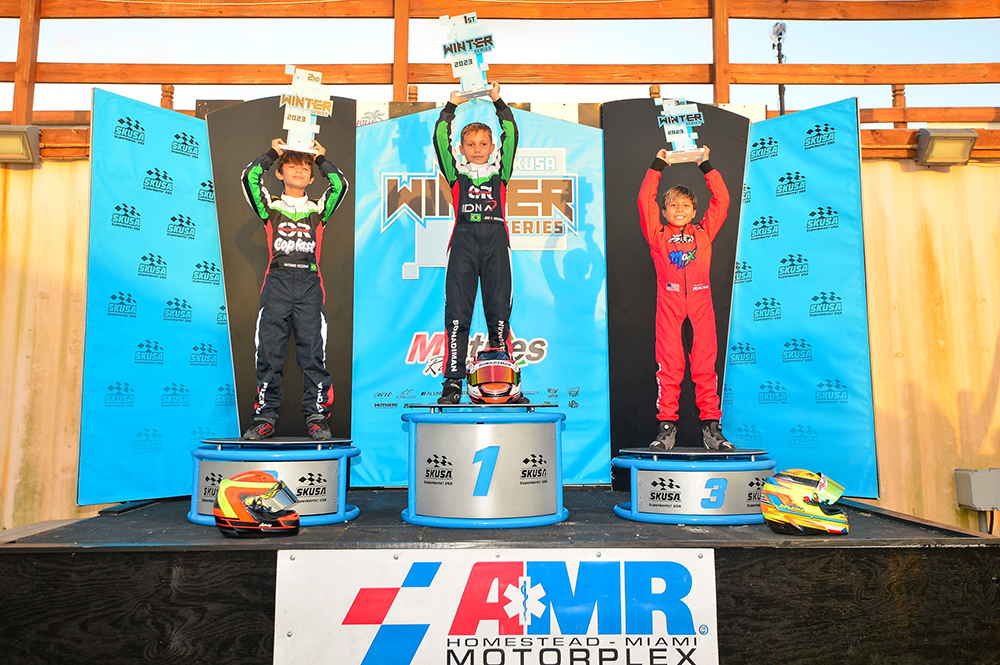 Compartilhar no Facebook Compartilhar no Twitter Compartilhar no Google+ Compartilhar no Pinterest Piloto brasileiro vence a 3ª rodada do Skusa Winter Series, um dos principais campeonatos de kart estadunidense O piloto capixaba João Paulo Bonadiman teve um final de semana de bom desempenho internacional. Integrante da categoria Micro Swift, Bonadiman conquistou o lugar de honra do pódio do 3º round (etapa), no Skusa Winter Séries, disputada no último sábado, 11 de fevereiro, no kartódromo AMR Homestead-Miami Motorplex, no estado da Flórida-EUA. Dos 28 pilotos concorrentes na categoria Micro Swift, João Paulo Bonadiman marcou o 4º melhor tempo no treino classificatório. Em disputas acirradas, terminou a corrida pré-final em quinto lugar, posição do grid na prova decisiva. Com boa largada, o piloto brasileiro assumiu o segundo posto e passou a perseguir o líder, campeão das duas primeiras etapas, Antonio Pizzonia Neto. As quatro últimas voltas foram emocionantes com três pilotos disputando curva a curva a melhor colocação. A poucos metros da linha de chegada Bonadiman deu o bote e garantiu a vitória à 0,066 milésimos de segundo para Pizzonia Neto, marcando ainda a volta mais rápida da prova. A 4ª rodada, disputada no domingo (12), ficou marcada pela superação do piloto. Segundo lugar no treino classificatório, a corrente do kart caiu na segunda volta da pré-final e Bonadiman foi obrigado a abandonar a prova. Largando a final do grid, o piloto brasileiro fez boa retomada cruzando a linha de chegada na 9ª posição, depois de alguns incidentes durante a prova. “Eu já tinha conquistado o pódio no primeiro e segundo round da competição (P3 e P4), que disputai em janeiro. Agora estou ainda mais motivado com a minha primeira vitória internacional e pela minha evolução durante o campeonato. Agradeço a dedicação da equipe Orsolon, ao Jeison Teixeira, da Racing DNA, que me acompanha nas provas do Skusa, e o apoio da minha família. Quero parabenizar também o brasileiro que correu comigo, Antonio Pizzonia Neto e a equipe Orsolon Racing pelo título de campeão da Winter Séries”, declarou o piloto capixaba, que disputa nesta semana, de 16 a 19/02, a Rok Cup Florida Winter Tour, no Kartódromo Piquet Race Park, em Loxahatchee Texto: Eni Alves Fotos: Divulgação (On Track Promotions)