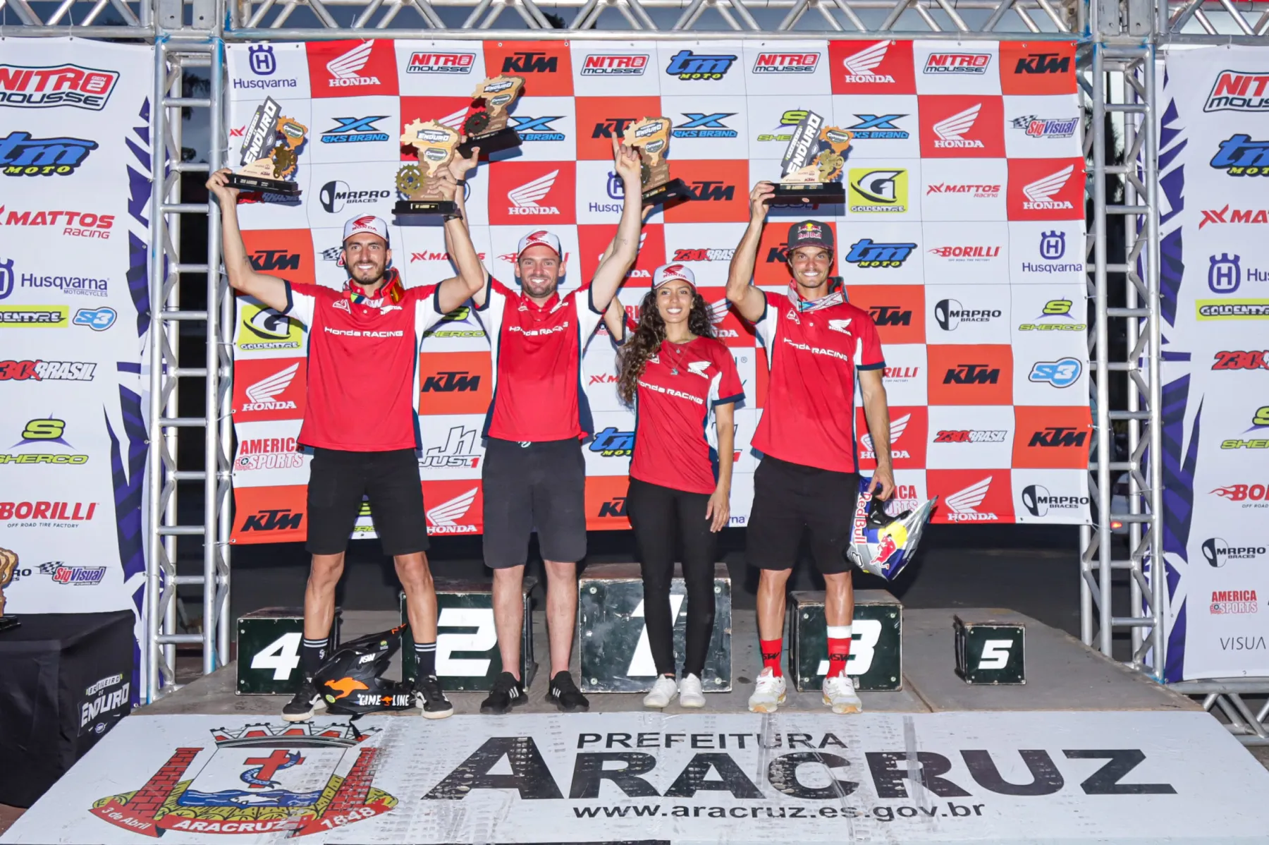 A equipe Honda Racing começou da melhor forma o Brasileiro de Enduro 2024. Bruno Crivilin (categoria E1 e a geral, chamada de Elite), Vinicius Calafati (E2), Alexandre Valadares, o Brankim (E4), e Bárbara Neves (EF) venceram a primeira prova do campeonato, em Aracruz (ES), encerrada neste domingo (10/3) após dois dias de disputas. Desta forma, eles começaram com força total a luta pelos títulos da temporada, sendo que o forte calor foi um desafio extra.