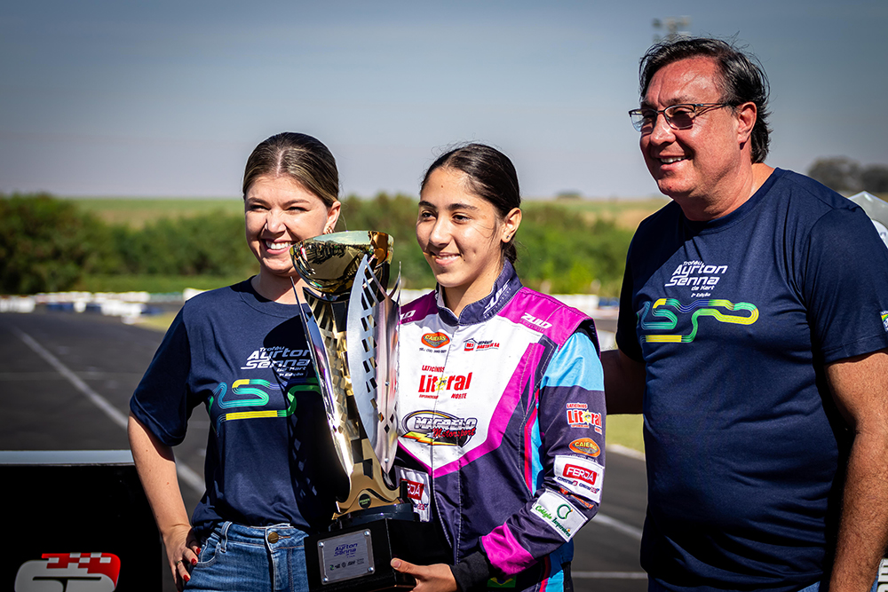 Compartilhar no Facebook Compartilhar no Twitter Compartilhar no Google+ Compartilhar no Pinterest Anna Luiza Pimpão recebe o troféu de homenagem de Ricardo Gracia (Speed Park) No evento de abertura a jovem piloto de Caraguatatuba recebeu o troféu Power Woman de kart A semana, encerrada no domingo (09), foi de disputas intensas para Anna Luiza Pimpão (Construjá/ Ferja/ Construdigi/ Litoral Norte/ Depósito Martin de Sá/ Concept Kart). Com o objetivo de se preparar melhor para o campeonato mais importante do ano, o Brasileiro de Kart, que será realizado em outubro no mesmo local, o piloto participou do Troféu Ayrton Senna, no SpeedPark, em Birigui, interior de São Paulo . Dos 165 pilotos em 10 categorias, apenas quatro representaram a classe feminina e Anna Luiza Pimpão teve uma boa colocação nas provas classificatórias, um quarto e um sétimo lugar. Eleita pela imprensa que esteve presente ela recebeu, no evento de abertura, o troféu Power Woman de Kart, com o intuito de motivar a participação das mulheres no kartismo brasileiro. Única mulher no grid formada por 10 participantes na categoria F4 Sprinter, Anna Luiza Pimpão conquistou o sexto lugar do pódio na prova final. “Me sinto muito feliz por receber o troféu Power Woman, que passa a ter um significado muito importante para mim. Não é fácil competir em um esporte em que 99% dos participantes são homens. A gente precisa se superar a todo instante, e não falo de superar os limites da pista, e sim, os meus próprios limites. Estou buscando desenvolver o meu potencial e a minha referência é o melhor competidor da minha categoria, e sei que com treino, esforço, dedicação, o ótimo trabalho da minha equipe Magrelo Motorsport e Concept Kart eu vou chegar lá”, declarou Anna Luiza Pimpão. Anna Luiza encerrou a semana de competições na tarde de domingo, na segunda edição da Seletiva Girls On Track, que contou com 38 meninas participantes, em três categorias. Pole position na prova final da categoria Graduados, ela brigava pela liderança quando, numa tentativa de ultrapassagem, o kart subiu na zebra de uma curva e acabou fora da pista. “Todas as meninas competem com kart RENTAL, de aluguel, que é diferente do que eu estou acostumada a pilotar. Cometi um erro que me custou uma possível vitória, mas estou feliz por ver que as meninas deste ano se prepararam melhor para a competição e tivemos disputas bem acirradas”, concluiu Anna Luiza Pimpão, campeã da primeira edição do Girls On Track. Jornalista responsável: Eni Alves Fotos: Diego Tartalho Anna Luiza Pimpão disputou o Troféu Ayrton Senna pela categoria F4 Sprinter Anna Luiza Pimpão conquista pódio no Troféu Ayrton Senna