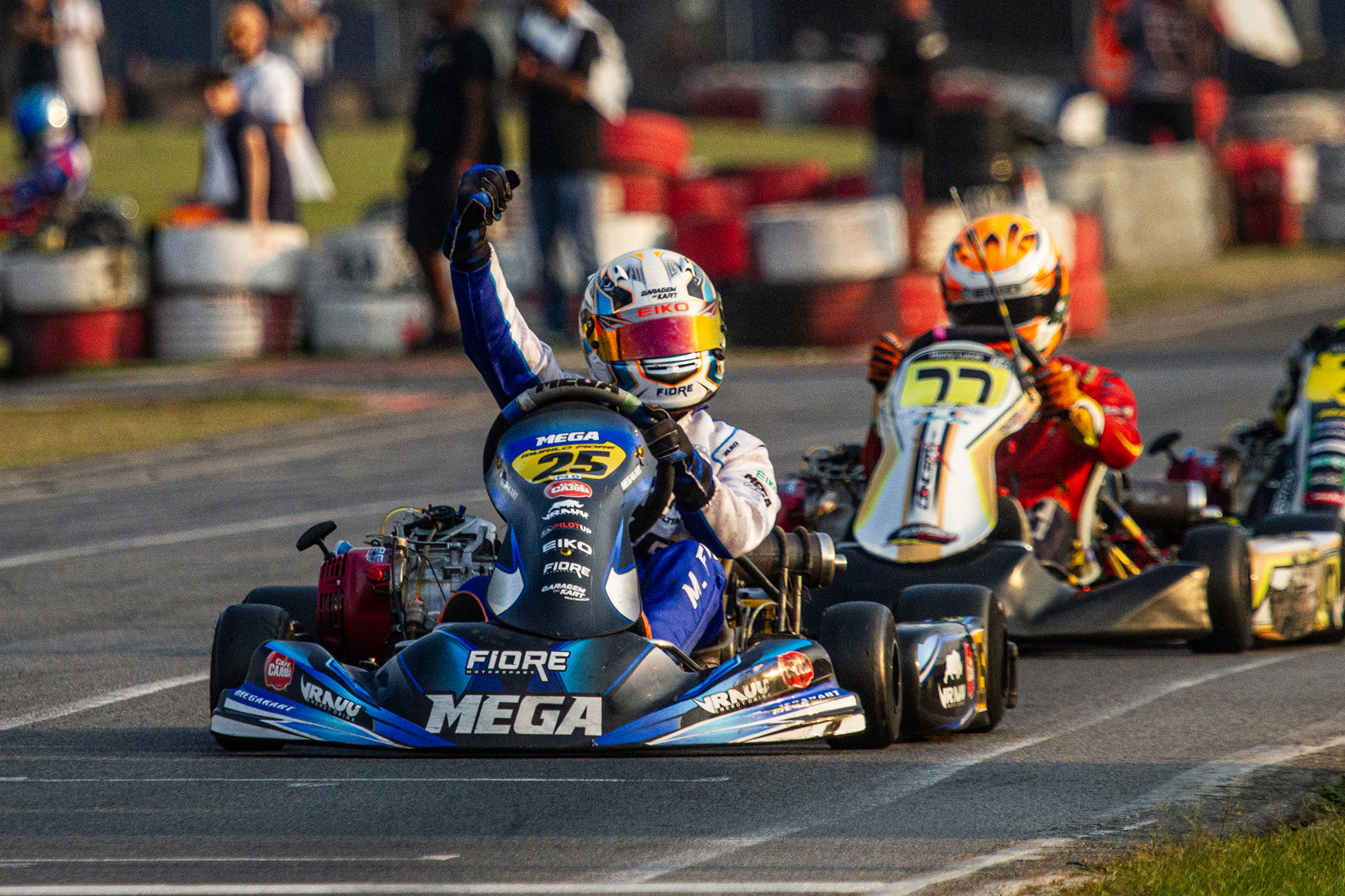 Compartilhar no Facebook Compartilhar no Twitter Compartilhar no Google+ Compartilhar no Pinterest Mantendo a invencibilidade no segundo turno do Light, piloto paranaense mantém sequência de vitórias consecutivas após o título na Copa Brasil de Kart Fotos: Jackson de Souza Dando sequência no principal campeonato estadual do kartismo brasileiro, Murilo Fiore (Mega Kart / Eiko / Café Cajubá / Garagem do Kart / Fiore Motorsport) conquistou sua quarta vitória na Copa São Paulo Light de Kart, ampliando sua a liderança no campeonato, após duas provas acirradas na sétima rodada realizada no Kartódromo Municipal Ayrton Senna, em Interlagos. Atual campeão da Copa Brasil de Kart, Fiore venceu sua terceira competição consecutiva desde a abertura do segundo turno da Copa São Paulo Light de Kart, e num show de ultrapassagens, se pôs como o principal destaque da categoria F4 Graduados, chegando também a sua quarta vitória no campeonato. Enfrentando contratempos técnicos nos primeiros treinos livres, a tomada de tempo foi marcada por uma melhora notável de desempenho, garantindo o quinto tempo com a diferença de 0.099s para a pole position. Diferença está que foi minimizada a zero, com o excelente ritmo volta a volta nas duas provas, garantindo a vitória de ambas as corridas, sendo na Corrida 2, com uma sequência de três ultrapassagens impressionantes, levantando o público do kartódromo, recebendo elogios de todos presentes ao final da prova. “Mais um final de semana muito bom para nós! Conseguimos finalizar mais uma etapa com a vitória, sendo a nossa quarta neste ano, ampliando ainda mais a liderança do campeonato.” – completou. Destaque da Corrida 2 com suas ultrapassagens fora do comum, Fiore comentou os acontecimentos como únicos. – “Chegamos em um momento do campeonato em que as disputas estão cada vez mais acirradas, e decidi arriscar em um local onde a maioria dos pilotos defendem posição. Deu certo a primeira, a segunda e a terceira ultrapassagem por fora na curva da balança aqui em Interlagos, em ultrapassagens volta após volta, que me levaram da quarta posição, até a vitória da prova final.” – finalizou Murilo, onde com a quarta vitória no campeonato, lidera a classificação da categoria F4 Graduados somando 64 pontos, contra 53 pontos do vice-líder. Confira o resultado final da categoria F4 Graduados na 7ª Etapa da Copa São Paulo Light: 01) 25 – Murilo Fiore 02) 07 – Giuliano Forcolin 03) 08 – Thiago Miranda 04) 77 – Henry Lucas 05) 61 – Guilherme Garcia 06) 65 – Gabriel Fernandes 07) 222 – Kleber Moura 08) 17 – Samuel Cruz 09) 03 – Gabriel Fantozzi 10) 101 – Andre Castro Confira a classificação do campeonato da F4 Graduados na Copa São Paulo Light de Kart: 01) 25 – Murilo Fiore – 64 pontos 02) 17 – Samuel Cruz – 53 pontos 03) 65 – Gabriel Fernandes – 49 pontos 04) 08 – Thiago Miranda – 47 pontos 05) 07 – Giulliano Forcolin – 46 pontos 06) 47 – Bruno Souza – 41 pontos 07) 101 – André Castro – 26 pontos 08) 115 – Ricardo Moraes – 23 pontos 09) 77 – Henry Lucas – 21 pontos 10) 118 – Guilherme Figueiredo – 18 pontos Acompanhe o piloto Murilo Fiore nas redes sociais: Facebook: facebook.com/murilo.fiore Instagram: instagram.com/murilofiore TikTok: @murilofiore Texto e Fotos: Jackson de Souza